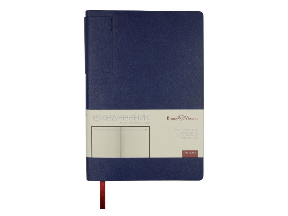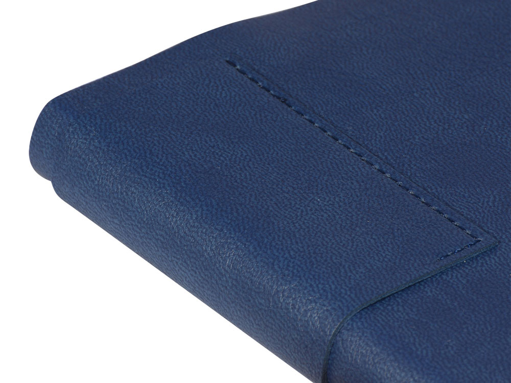 Лаконичная модель в ярком исполнении: гибкая обложка синего цвета с контрастной или в цвет обложки нашивкой. Выполнен из качественной и прочной искусственной кожи, крепление внутреннего блока - книжный переплет, закладка- ляссе. Углы обложки скруглены.