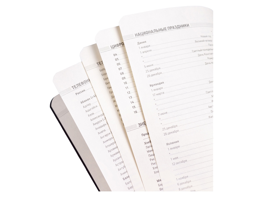 В ежедневнике Megapolis Flex есть полезная справочная информация и телефонная книга, а также страницы для записи идей, мыслей и составления рабочих планов. Для изготовления страниц используется качественный бежевый офсет повышенной плотности (70 г/кв м). Блок не привязан к конкретным датам – они указываются в выделенном поле вверху страницы. Тонированная бумага не дает глазам утомиться даже при длительной работе.