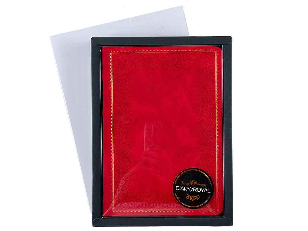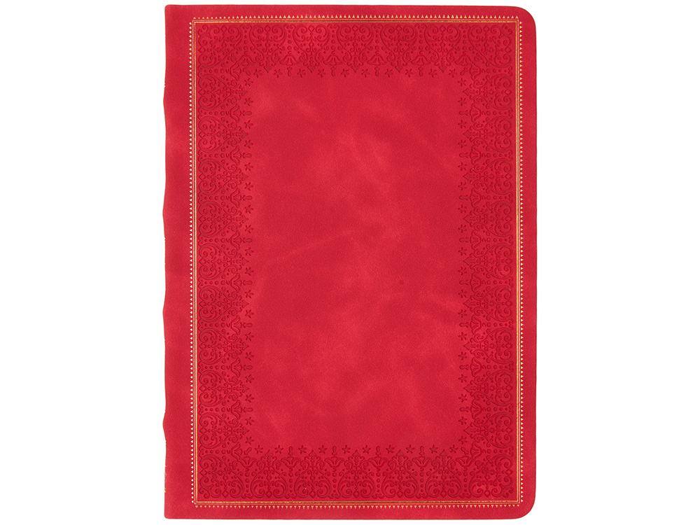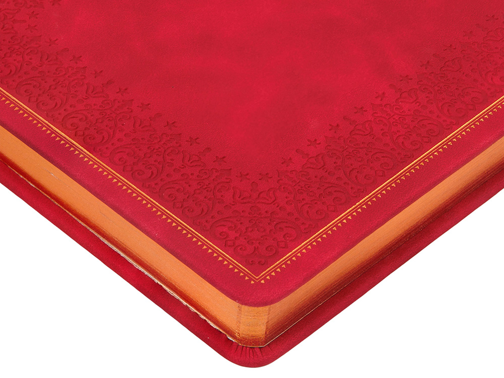 Недатированный ежедневник Royal формата А4 с твердой обложкой из искусственной кожи с имитацией нубука украшен художественным бронзовым и блинтовым тиснением. Внутри 192 страницы, выполненные из качественной бежевой бумаги в линейку плотностью 140 г/м². Два шелковых ляссе в цвет обреза блока и обложки облегчают навигацию по записям. Французский корешок дополнительно декорирован изящным бронзовым тиснением в виде виньеток. Скругленные углы обложки и блока подчеркивают стильный дизайн изделия, а блеск бронзового обреза дарит ежедневнику благородный и роскошный внешний вид.