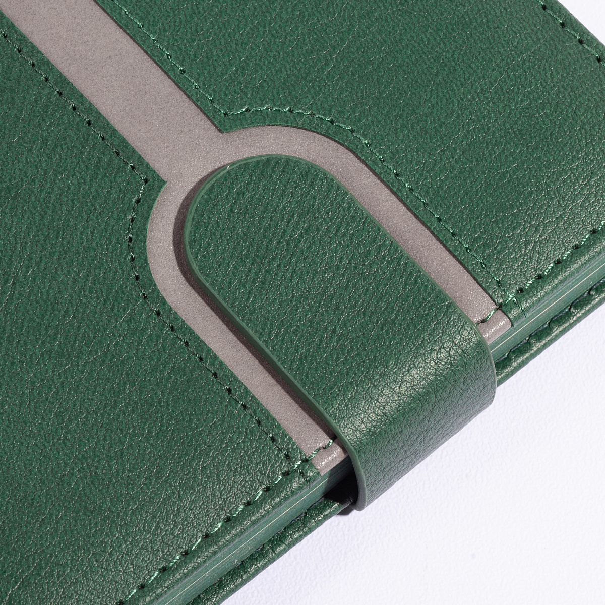 Матовая плотная обложка с выраженной текстурой натуральной кожи дополнена стильным вырезом – полосой серого цвета с прошивкой по периметру. Внутренний блок включает 256 страниц из бумаги плотностью 70 гр., срезом в цвет обложки и закладкой-ляссе, благодаря которой его удобно сразу открывать на нужной странице.