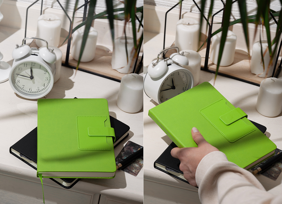 На лицевой стороне ежедневника предусмотрен карман для карт, записок, визиток. Чтобы заметки и записи были под контролем, а пользователь в любой момент мог внести новую информацию - у "Монти" предусмотрена петелька для ручки. Кроме того, ежедневник закрывается на магнитный хлястик.