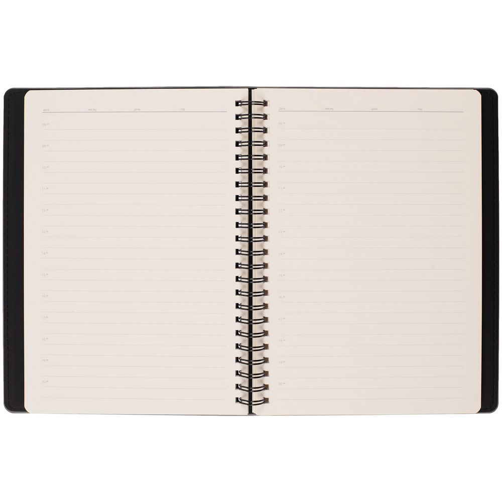 Ежедневник с блоком на пружине в твердой обложке, выполнен из материалов Nubuk Touch, зеленый FF и Soft Touch, черный AA.