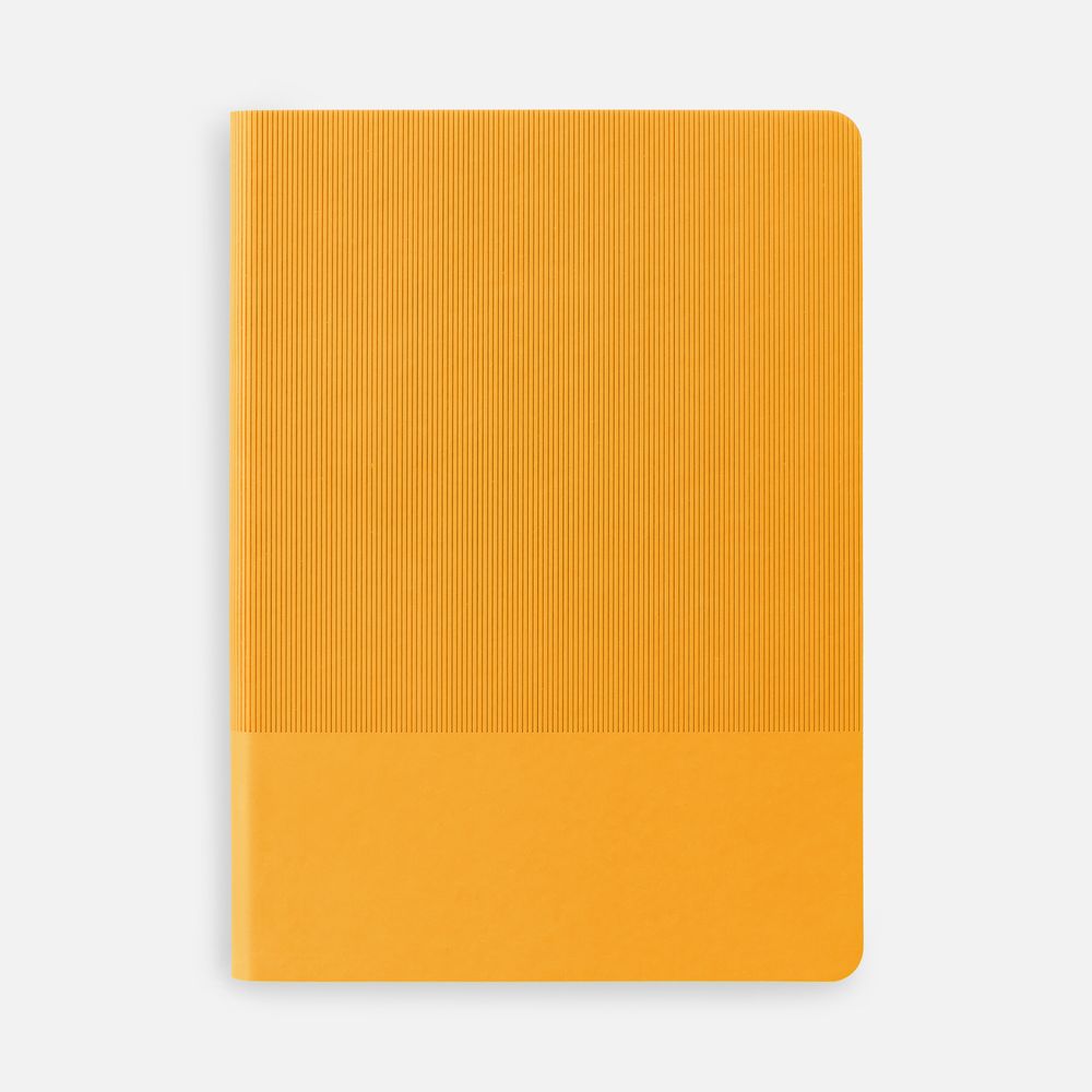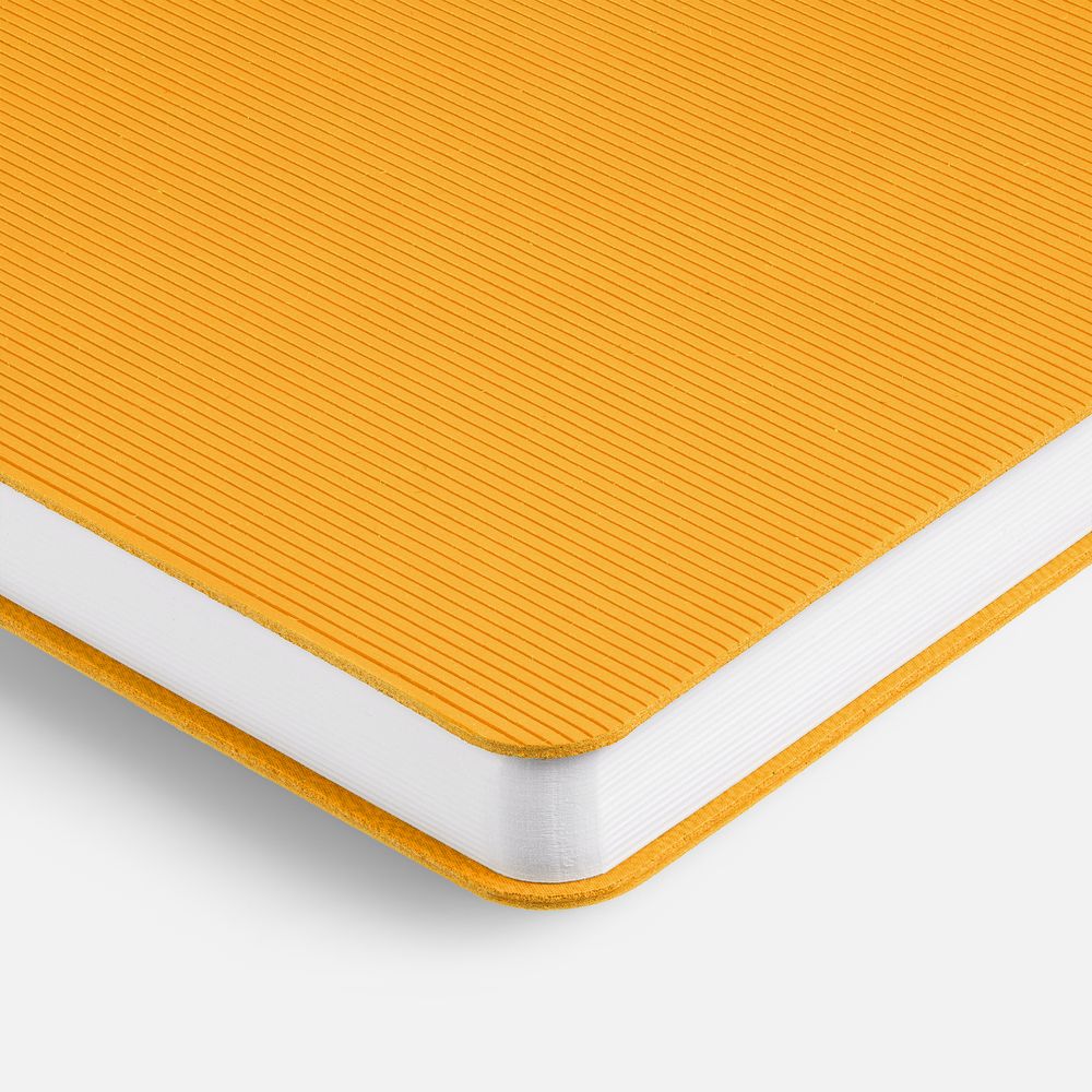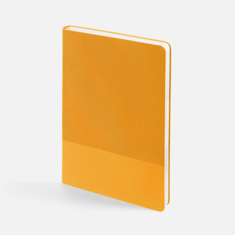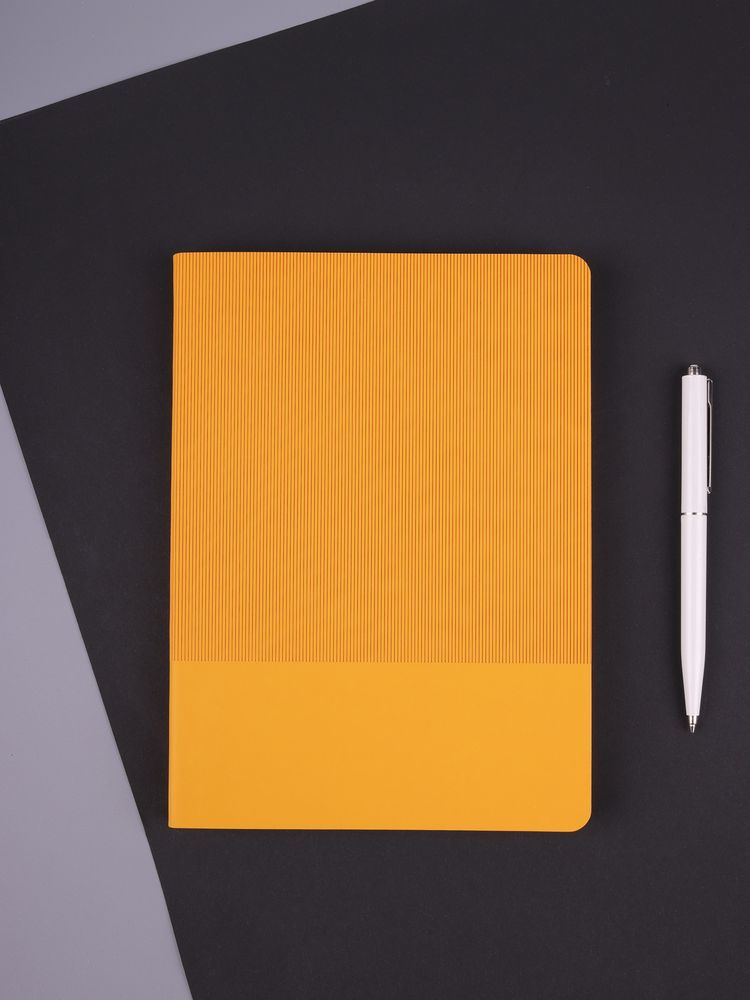 Ежедневник с гибкой обложкой выполнен из материала Soft Touch, желтый KK и Latte, желтый (внутренний материал), дополнен ляссе желтого цвета и фактурным тиснением обложки.