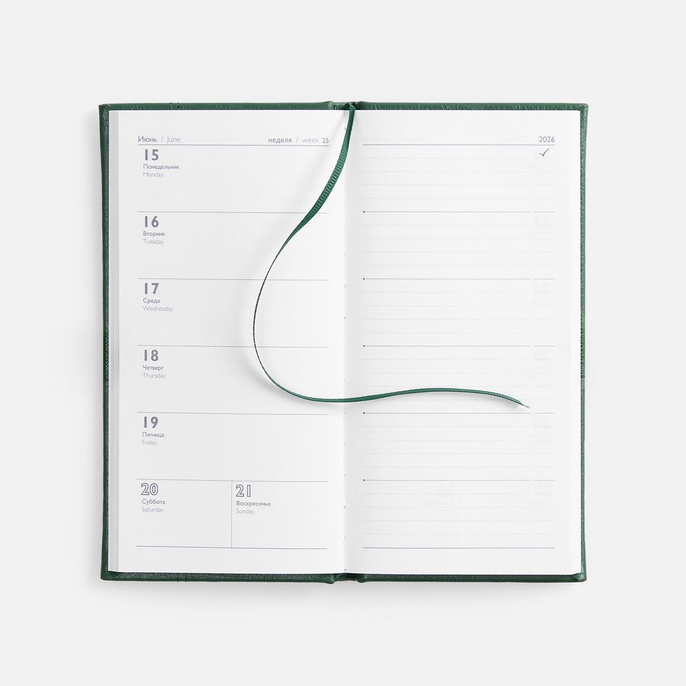 Еженедельник с твердой обложкой с поролоном из искусственной кожи, дополнен декоративной строчкой, капталом и ляссе в цвет.