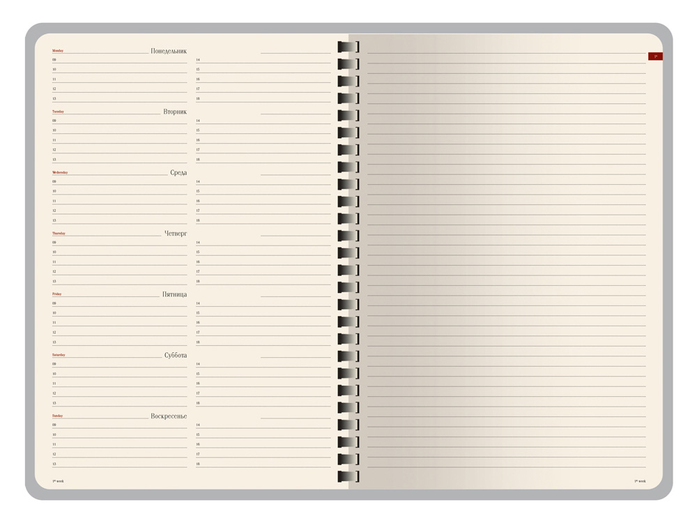 Недатированный блок состоит из 128 страниц, укреплённых на пластиковом полускрытом гребне. На 21 странице размещена справочная информация на русском языке. День недели указан на русском и английском языках.