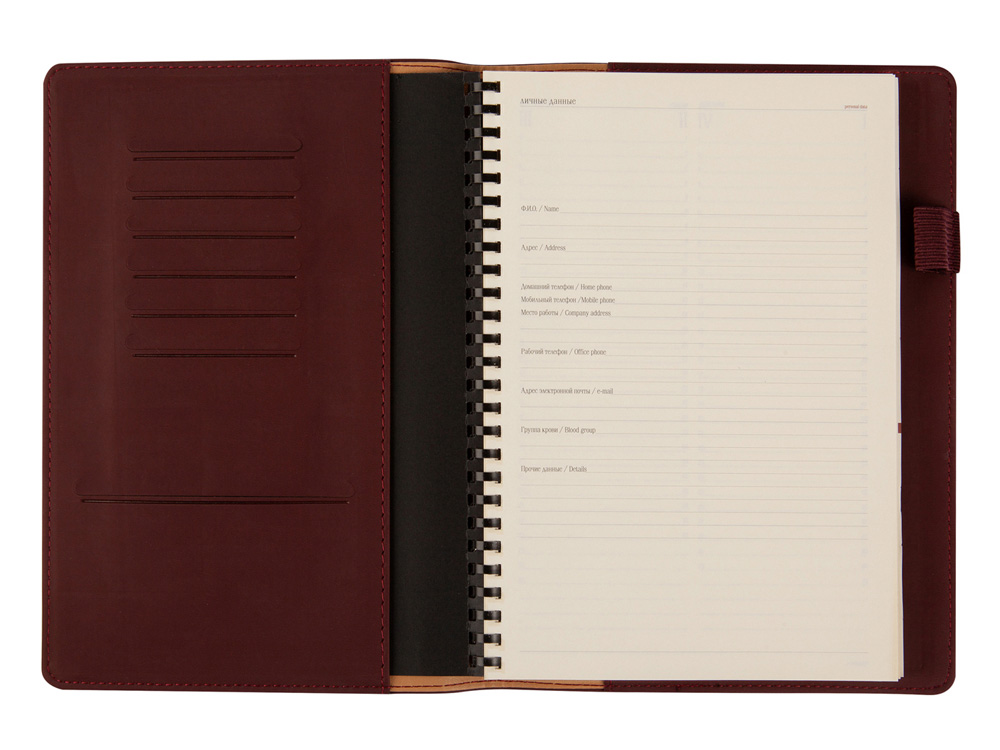 Блок является сменным и вставляется внутрь обложки. С внутренней стороны обложка имеет вырубные отделения для визиток и кредитных карт, а также петлю для ручки на резинке. Для хранения чеков, записок и бумаг внутри расположен прозрачный пластиковый конверт.