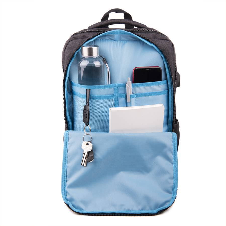 Основное отделение с плотной эргономичной спинкой, дополнительным разделителем, с карманом с RFID защитой для размещения самых ценных предметов и встроенным USB Внешнее отделение с мелкими кармашками для мелочей и держателем для ключей со съёмным колечком и светоотражающей деталью