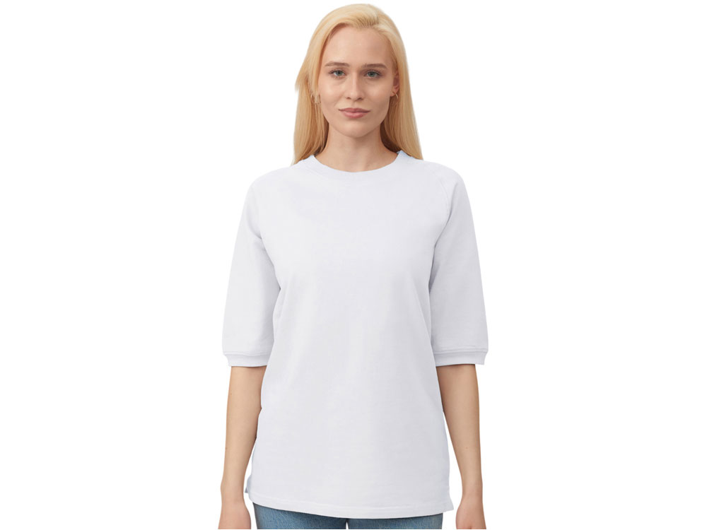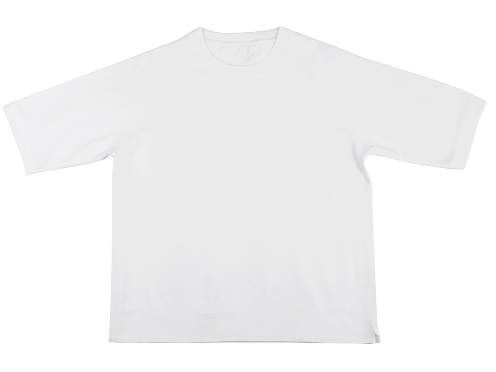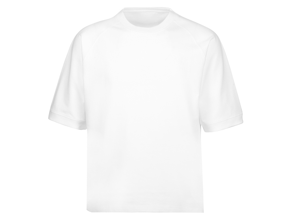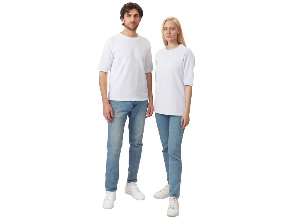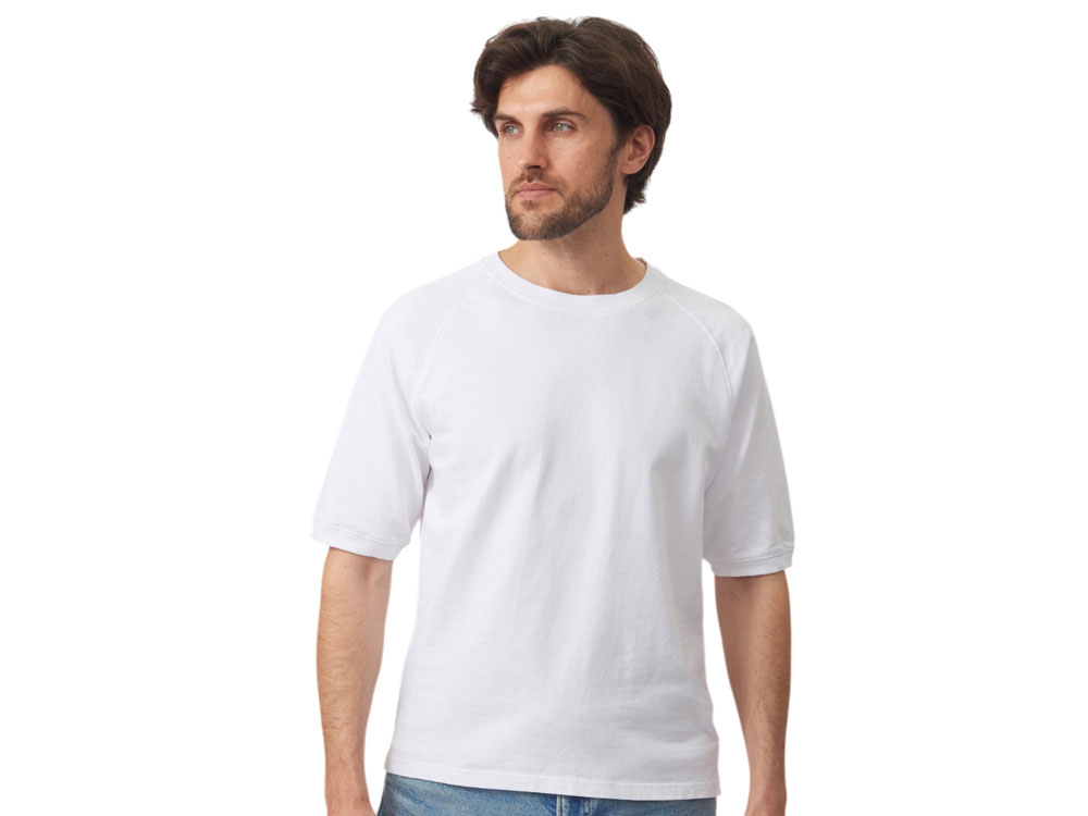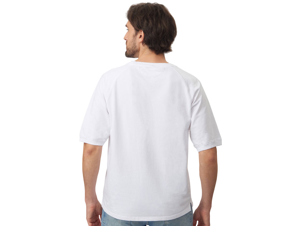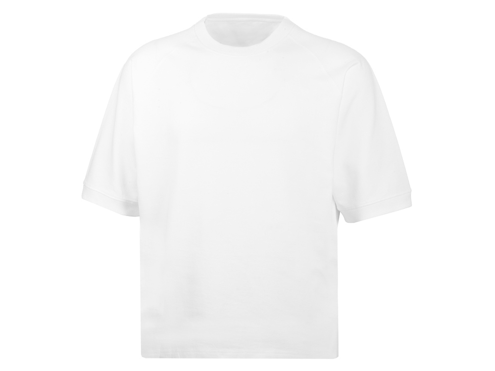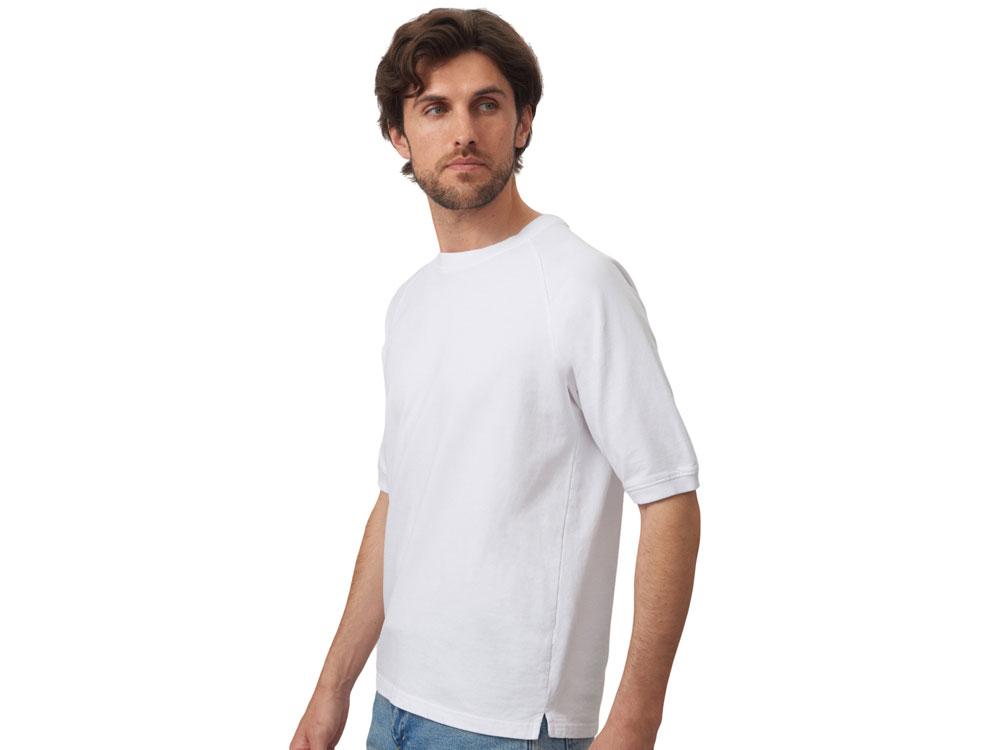 Футболка выполнена из хлопкового френч терри с петельками на изнаночной стороне. Горловина обработана рибом 2х2 и дополнительно усилена тесьмой-елочкой с внутренней стороны спинки и дополнена кокеткой по спинке для нанесения логотипа клиента. Рукав реглан продублирован рибом по низу. Разрезы в боковых швах. Гладкая поверхность полотна позволяет идеально нанести изображение. Футболка комфортного силуэта.
