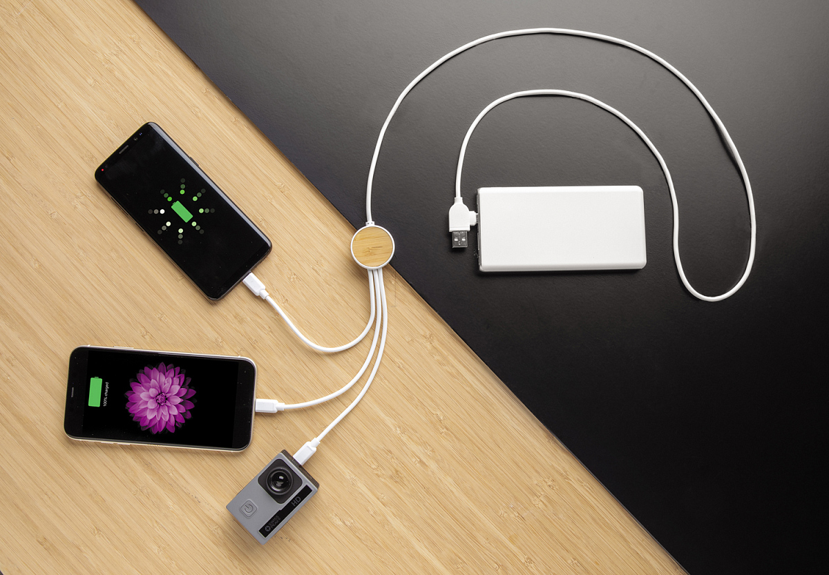 Универсальный кабель с 5 разъемами: вход USB C, вход USB A, выход Type C, выход для устройств IOS и выход micro USB. Это позволяет использовать кабель для устройств с выходами Type C, которыми оснащены многие современные смартфоны и ноутбуки Macbook. Кроме того, в кабеле есть разъем USB A, что делает его универсальным. Сделан из бамбука, пластика ABS и материала TPE (без ПВХ). Длина кабеля 120 см. Длина 100 см., ширина 3 см., высота 2 см., диаметр 0 см.