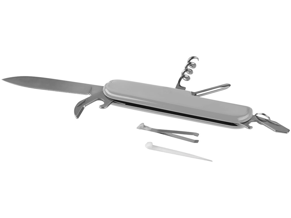 Карманный 9-ти функциональный нож Emmy. Карманный нож с отверткой Philips, плоской отверткой, открывалкой для банок и для бутылок, штопором, ножом для писем, пинцетом, зубочисткой и ножиком. В комплекте колечко для ключей. АБС пластик.