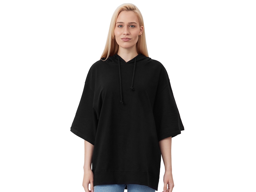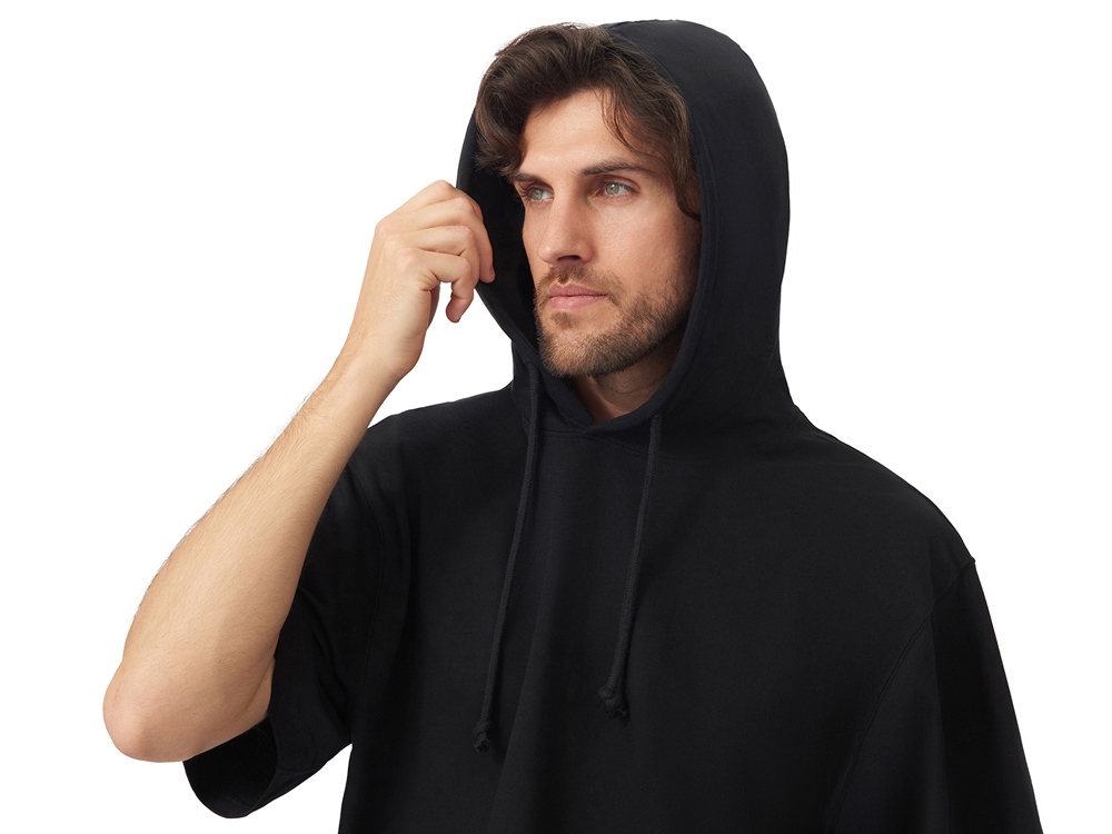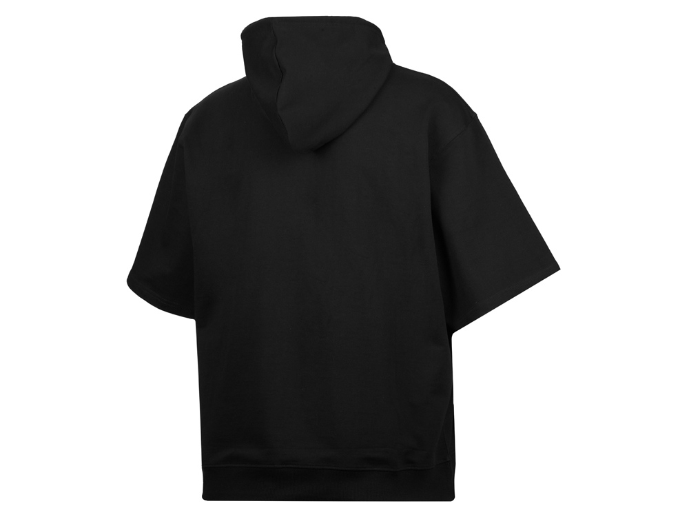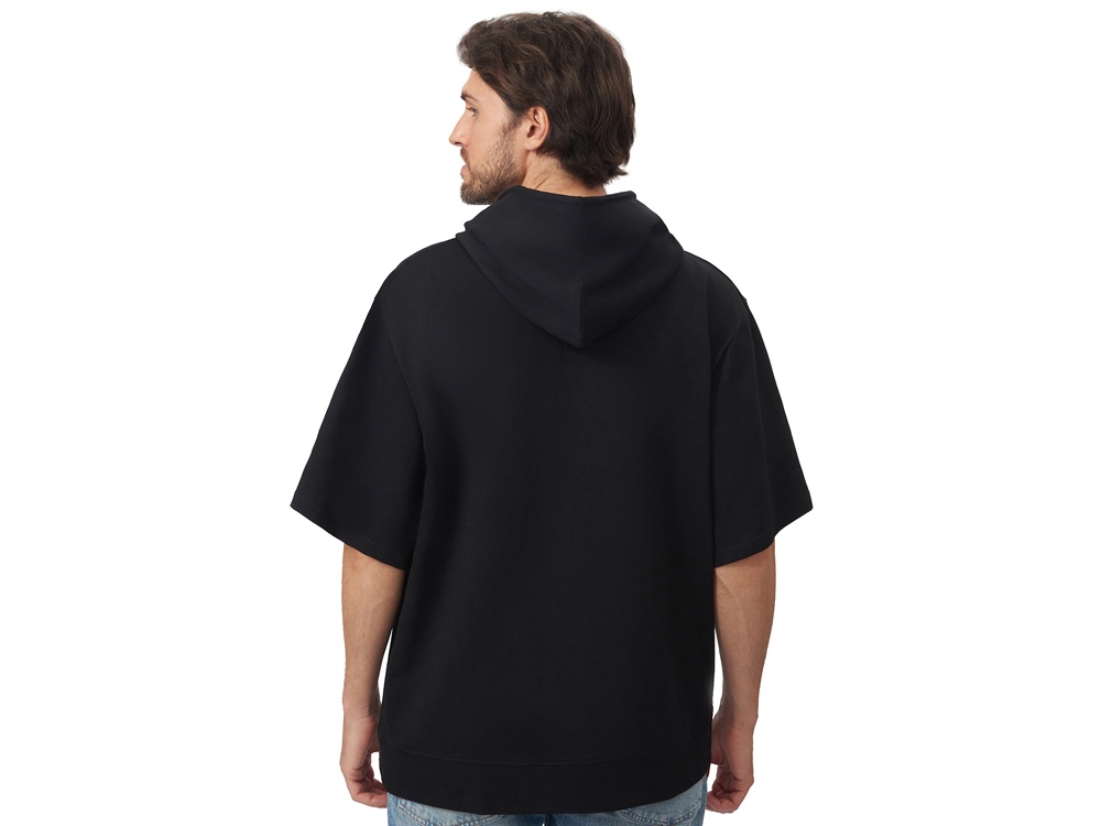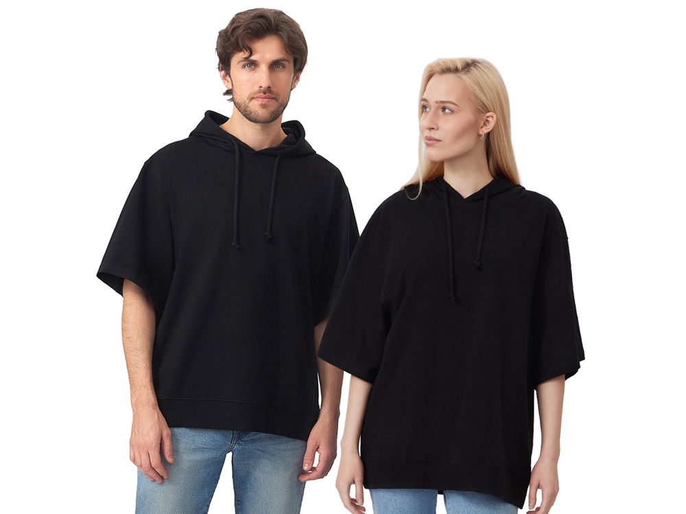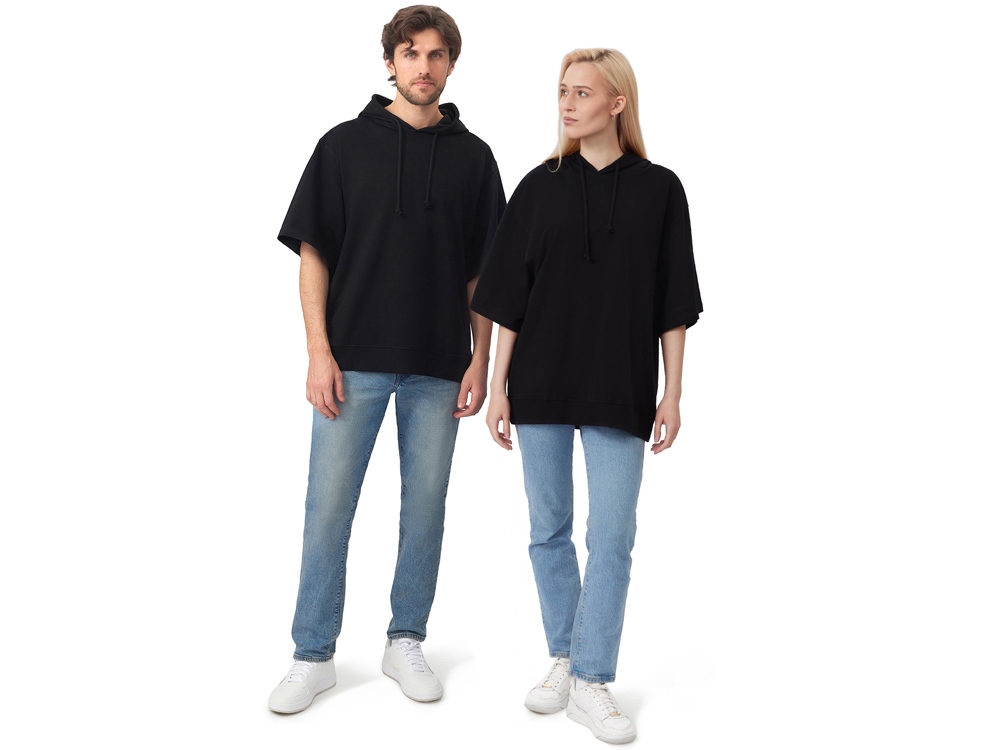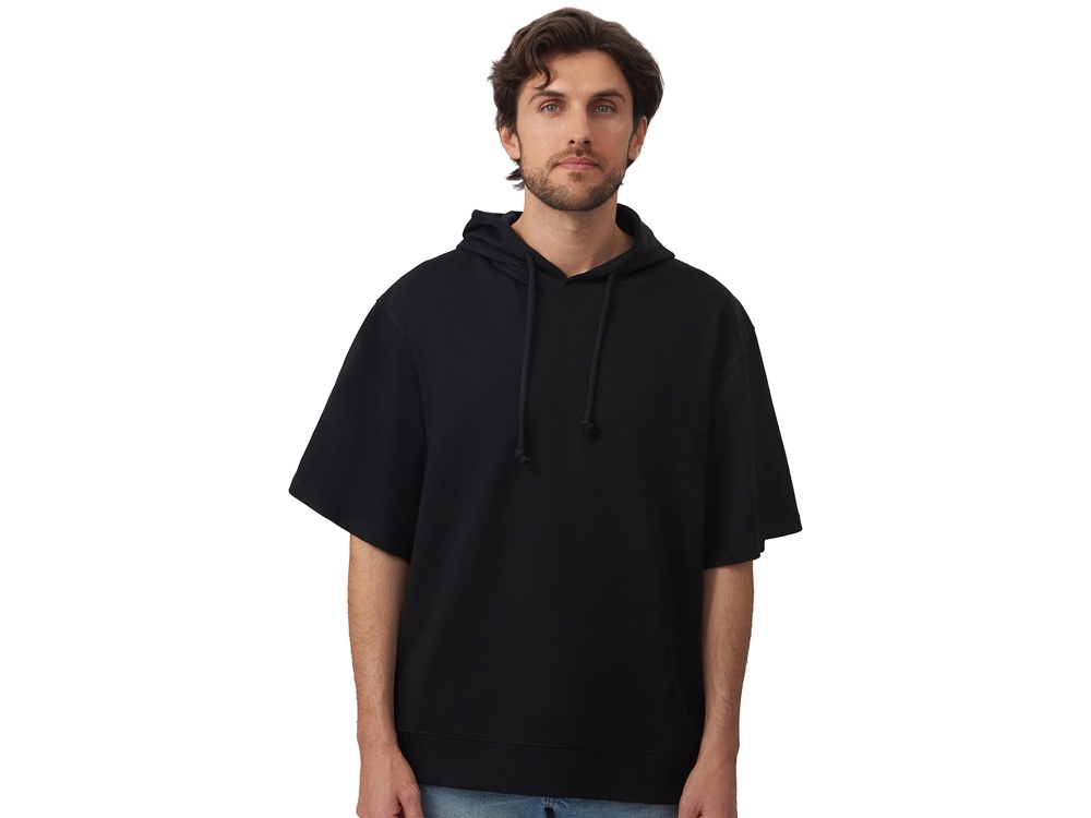 Худи с коротким рукавом выполнено из хлопкового френч терри с петельками на изнаночной стороне. Подкладка капюшона выполнена из основного полотна для объемной посадки. Модель комфортной и актуальной посадки оверсайз отлично подходит для обычной жизни и в качестве промо мерча.