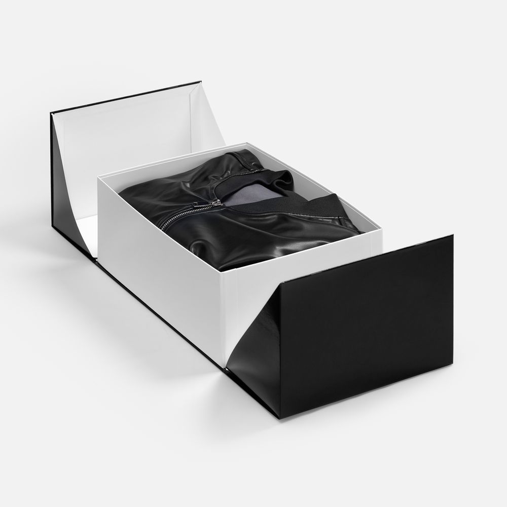 Коробка из переплетного картона 2 мм с оригинальной конструкцией: две симметричные створки открываются, создавая эффектную презентацию содержимого. Складная система на предустановленный двусторонний скотч делает сборку коробки быстрой и интуитивно понятной.