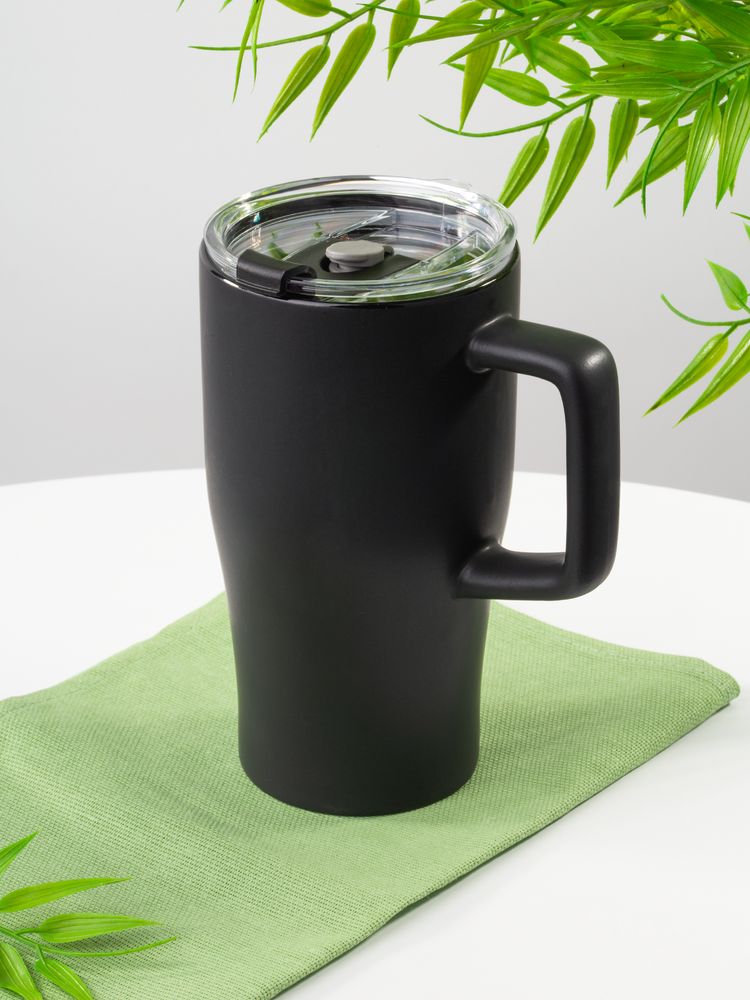 Эргономичная ручка удобно лежит в руке, а прозрачная крышка с отверстием для питья не дает содержимому разлиться на ходу или быстро остыть. Последнее особенно важно с учетом большого объема — 520 мл чая, кофе или какао хватит надолго.