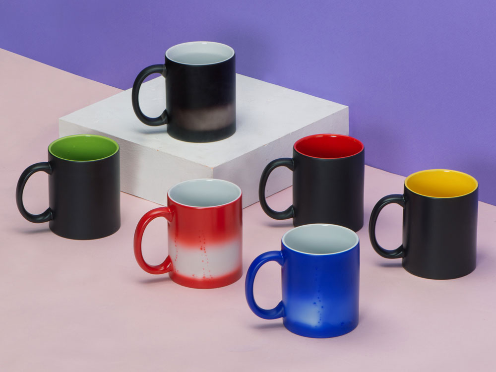 Кружка-хамелеон меняет свой облик, едва вы нальете в нее горячий напиток: черная поверхность постепенно изменяет свой цвет, становясь белой. Внутренняя часть кружки — яркая, цветная, что можно красиво обыграть, удачно сочетая ее с цветом вашего лого или гаммой изображения.