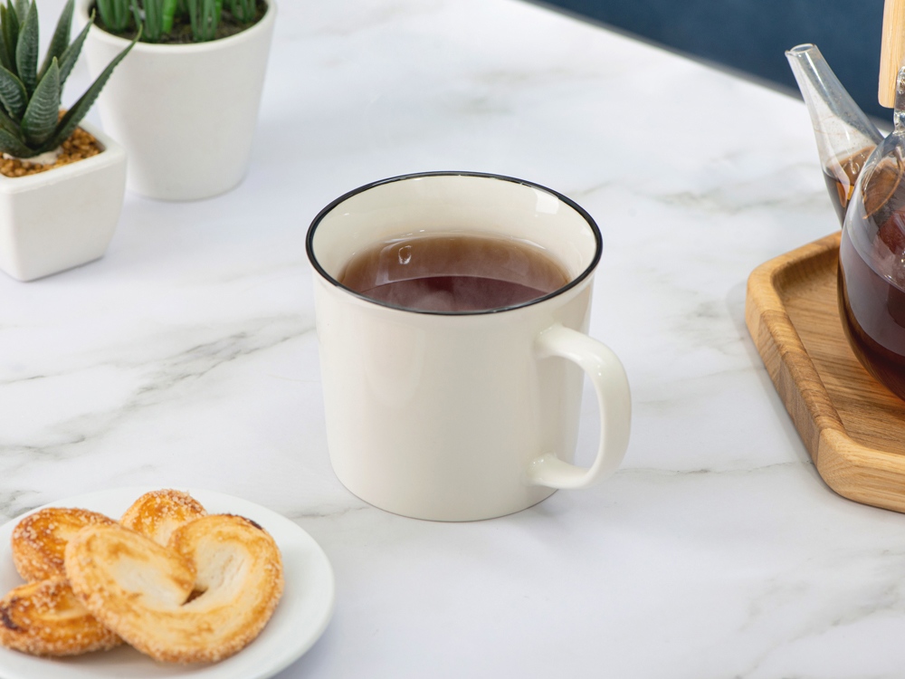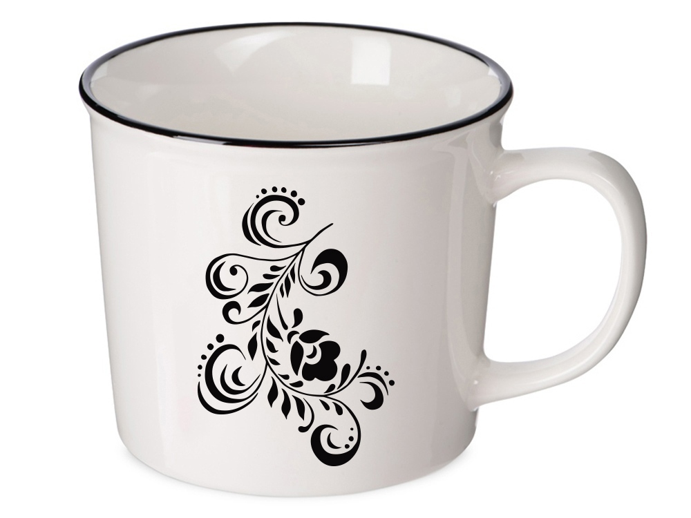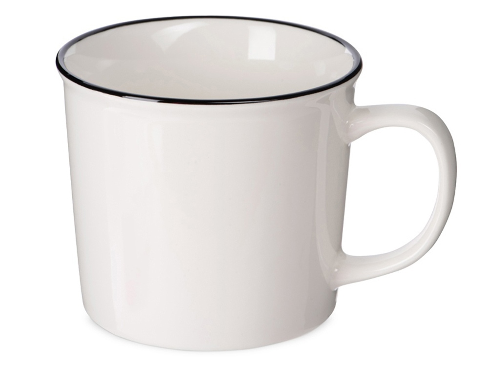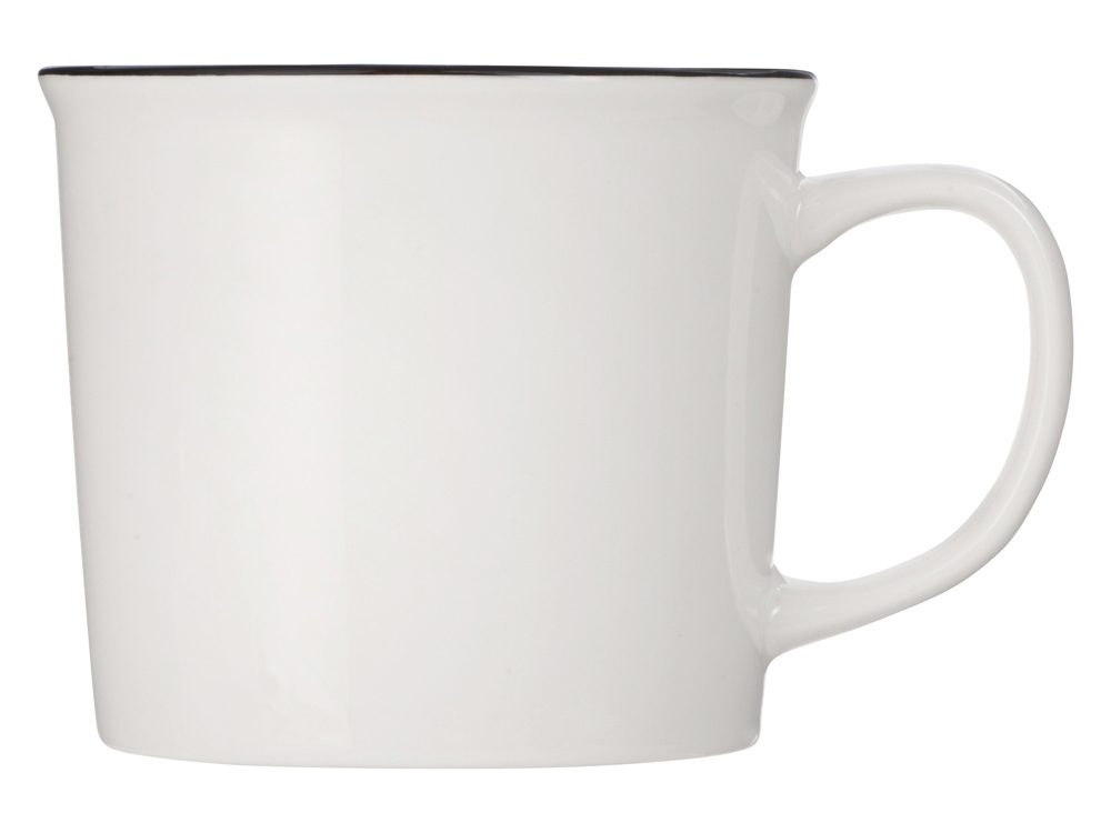 Кружка из костяного фарфора с выраженным рельефным ободком, окаймленным цветной контрастной полосой. Цвет полосы можно органично сочетать с цветом нанесенного логотипа, что придаст дизайну конечного продукта цельность облика.