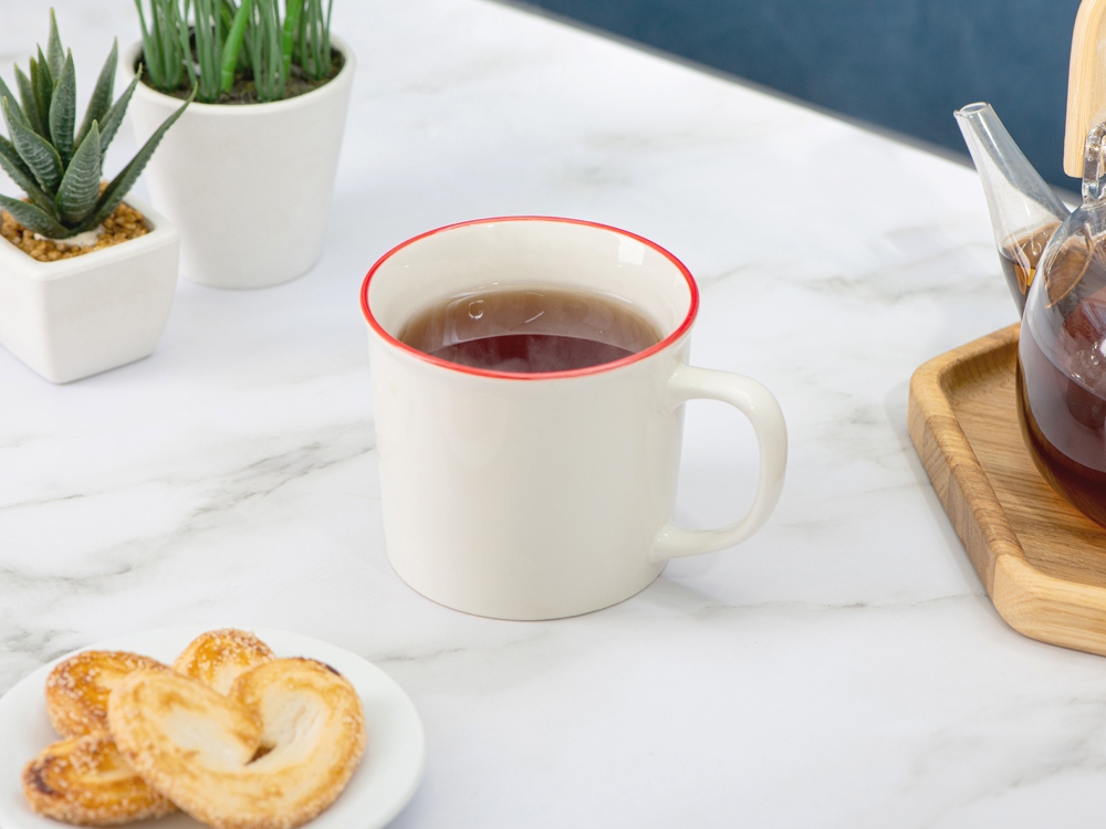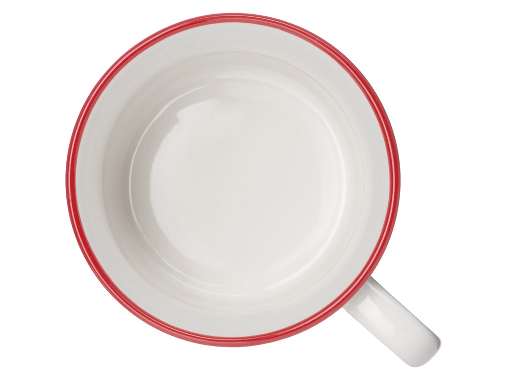 Кружка из костяного фарфора с выраженным рельефным ободком, окаймленным цветной контрастной полосой. Цвет полосы можно органично сочетать с цветом нанесенного логотипа, что придаст дизайну конечного продукта цельность облика.
