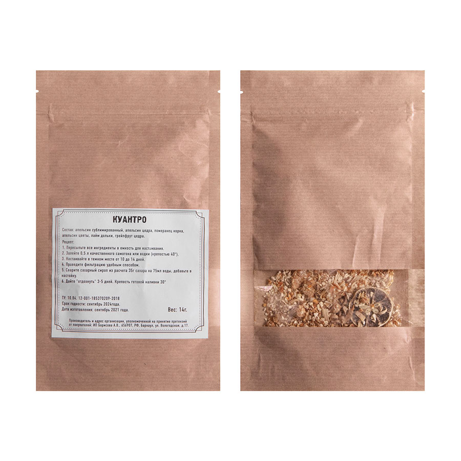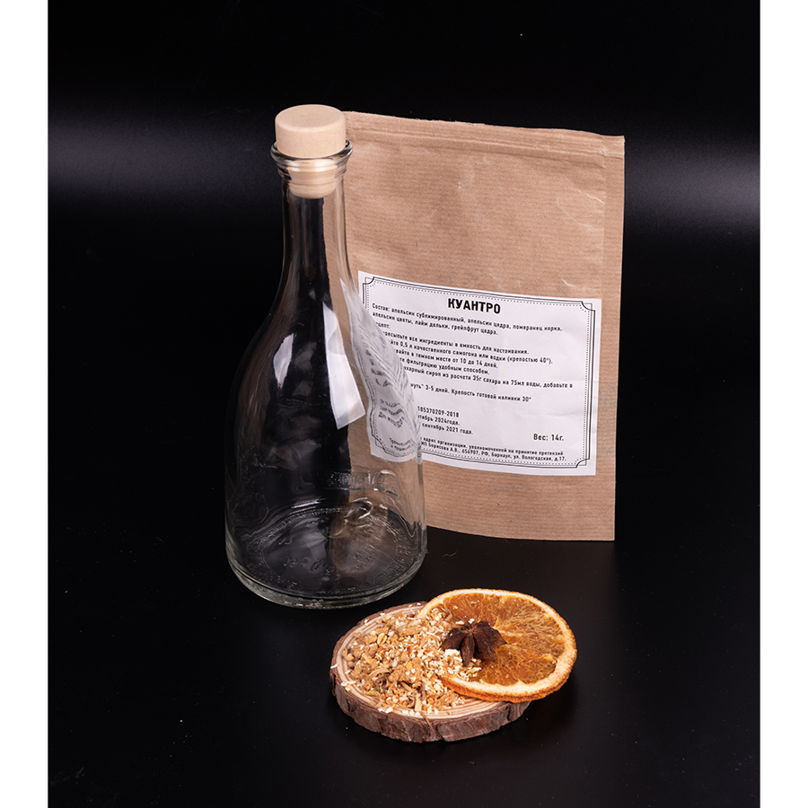 Мятный ликер - один из самых душистых алкогольных напитков. Домашний мятный ликер обладает неповторимый яркий аромат и мягкий вкус. Прекрасный вариант к десерту, чаю или кофе. Состав: листья перечной мяты, сушеная цедра лимона. Куантро — французский крепкий прозрачный ликер с ароматом корочек сладких и горьких апельсинов и померанцев. Пьют Куантро сильно охлажденным до 4-6°C маленькими глотками из классических ликерных рюмок. Хорошо сочетается с охлажденным апельсиновым и грейпфрутовым соками в любых пропорциях. Состав: апельсин сублимированный, апельсин цедра, померанец корка, апельсин цветы, лайм дольки, грейпфрут цедра.