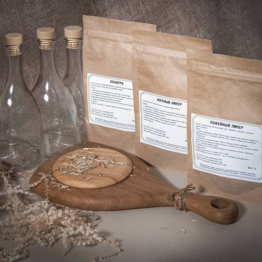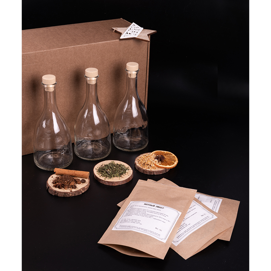 В состав набора арт. 39476 входят: - стружка- коробка подарочная арт. 34931, размер 40 х 25 х 15 см- три стеклянные бутылки объемом 0,5 литра- три полимерные пробки- три сбора для приготовления ликеров.