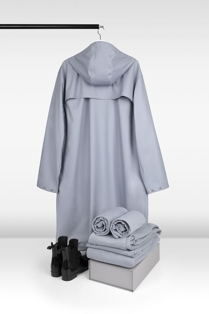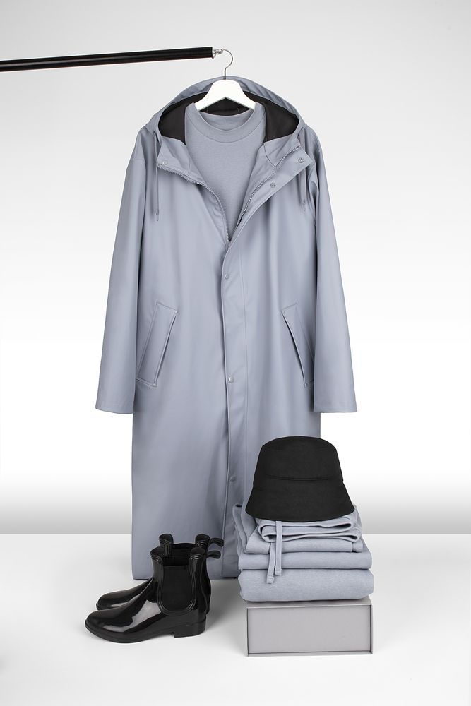 Плащ-дождевик с капюшоном из полиэстера с полиуретановым непромокаемым покрытием.