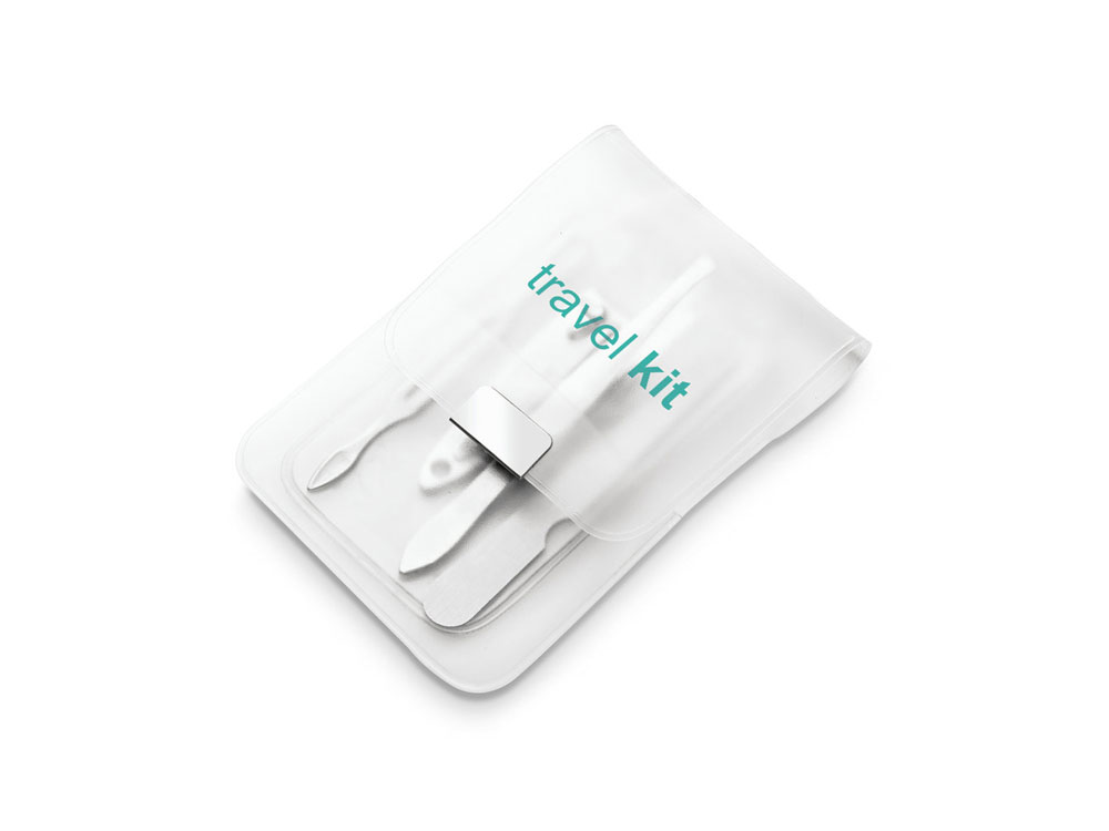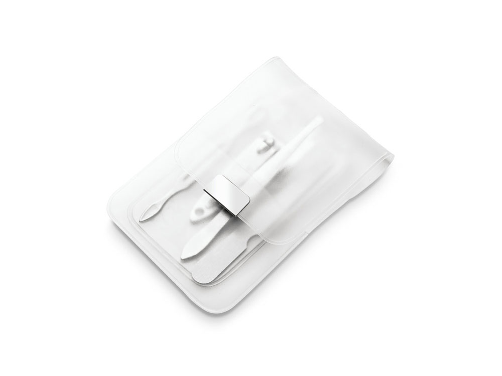 Набор из 4 предметов для маникюра в пакете из ПВХ, состоящий из пилочки, пинцета, щипчиков для ногтей и лопатки для кутикулы. 66 x 105 мм. Вид нанесения, рекомендуемый поставщиком: трафаретная печать, гравировка.