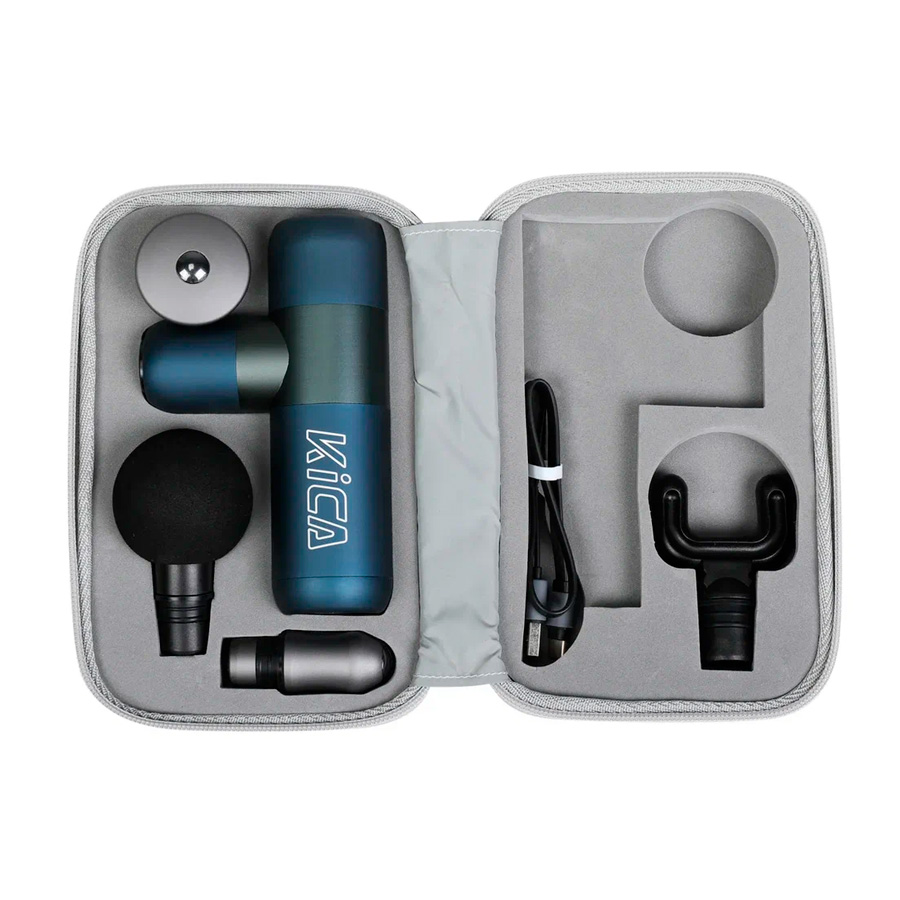 Комплектация: перкуссионный массажер, вилочная насадка, 1 шт., шаровая насадка, 1 шт., магнитная плоская насадка, 1 шт., магнитная пулеобразная насадка, 1 шт., кабель USB Type-C для зарядки, ремешок для переноски, кейс для хранения, инструкция по эксплуатации