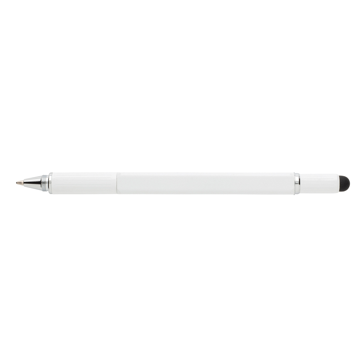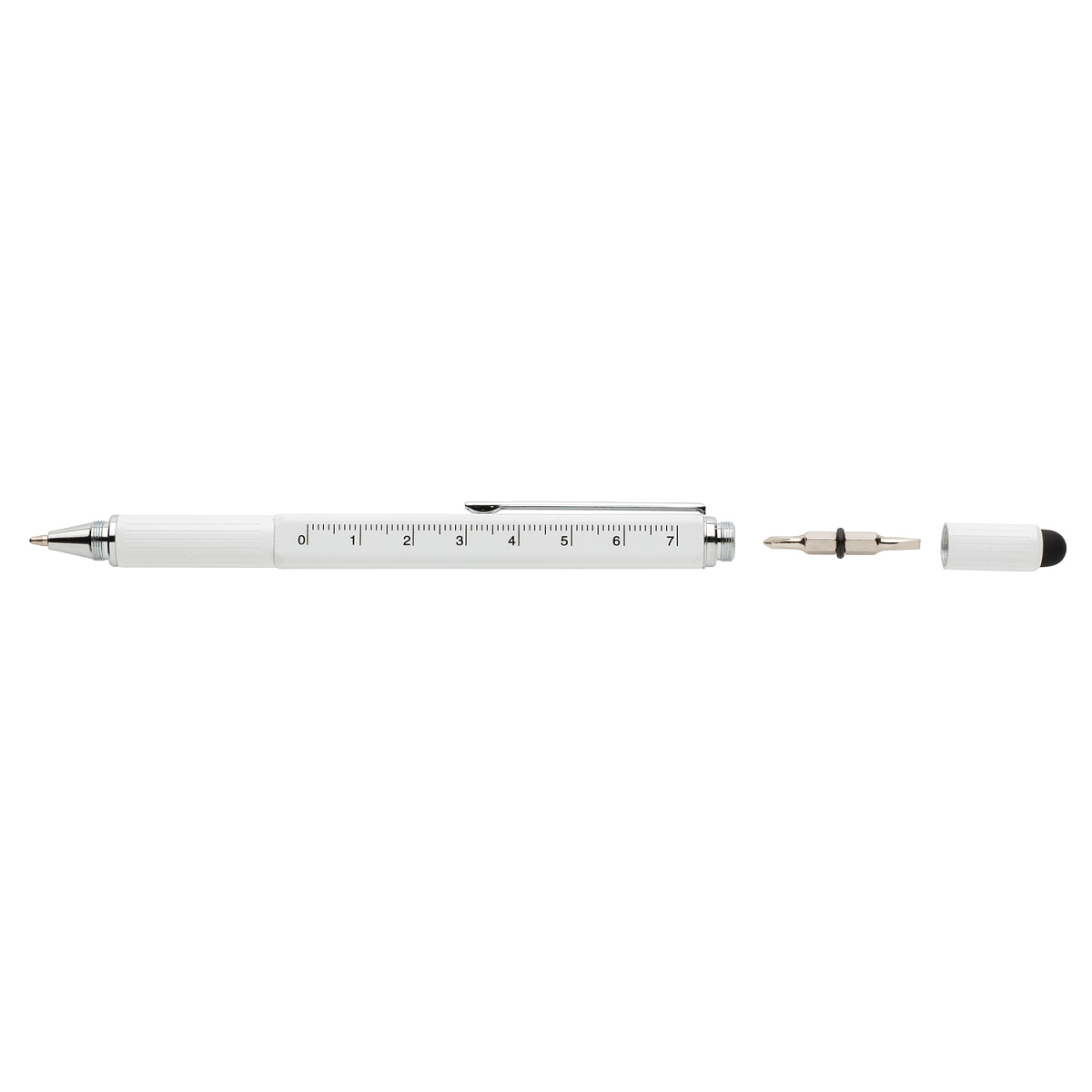 Многофункциональная ручка совмещает в себе линейку длиной 7 см, спиртовой уровень, отвертку, стилус и синюю шариковую ручку, чернил в стержне которой хватит на линию длиной до 400 м. Корпус ручки изготовлен из высококачественной латуни и дополнен удобным алюминиевым клипом. , ширина 1,3 см., высота 15 см., диаметр 0 см.