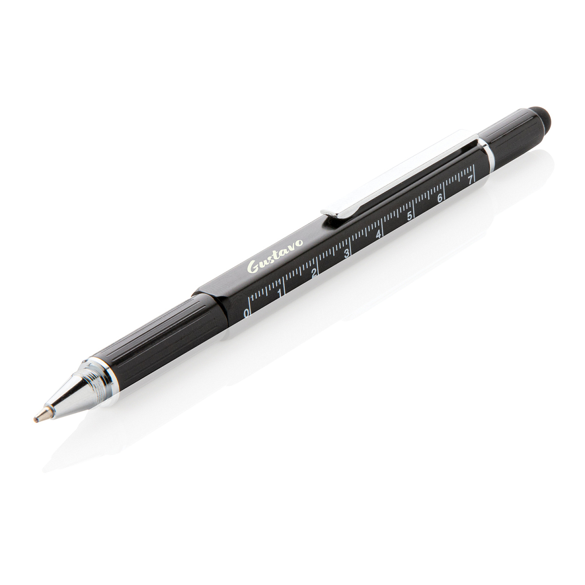 Многофункциональная ручка совмещает в себе линейку длиной 7 см, спиртовой уровень, отвертку, стилус и синюю шариковую ручку, чернил в стержне которой хватит на линию длиной до 400 м. Корпус ручки изготовлен из высококачественной латуни и дополнен удобным алюминиевым клипом. , ширина 1,3 см., высота 15 см., диаметр 0 см.