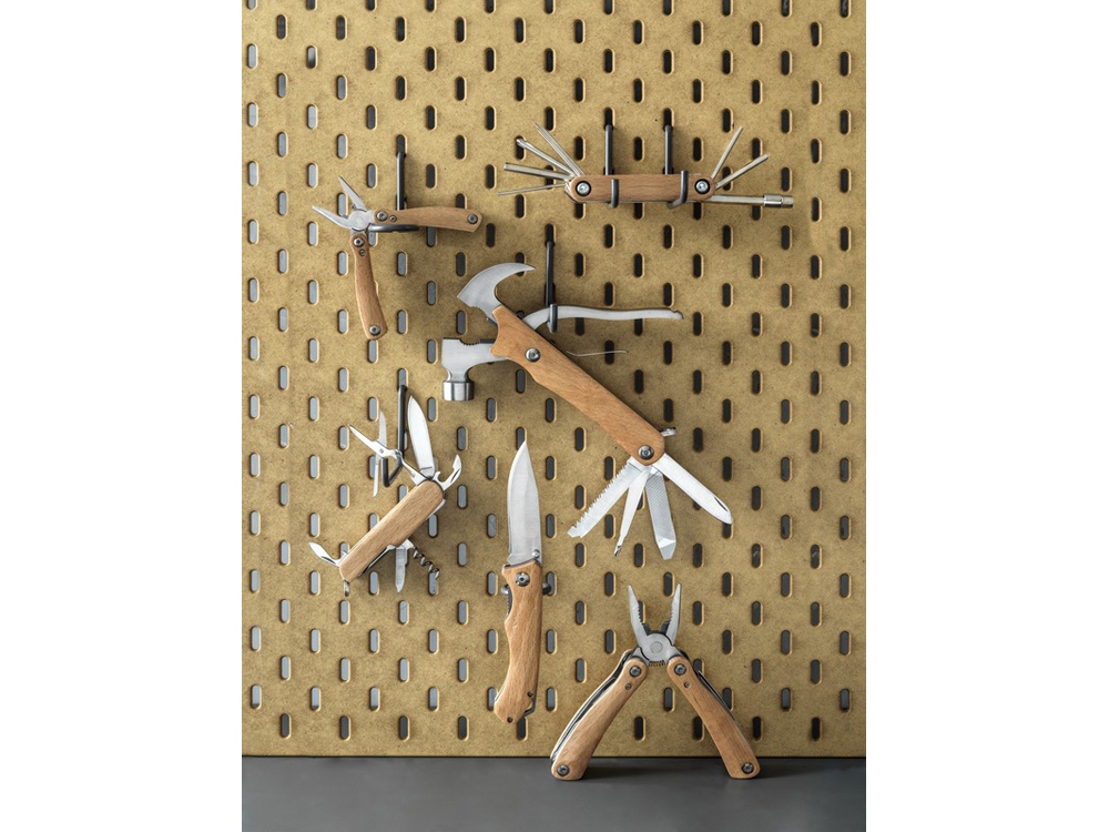 Прочный, долговечный и компактный многофункциональный инструмент из качественной нержавеющей стали с ручками из буковой древесины. Обязательный аксессуар для любого скаута, мастера и других любителей выживания или активного отдыха. Используемая буковая древесина поступает от надежных поставщиков, соблюдающих все экологические и социальные нормы. Размер этого многофункционального инструмента в открытом состоянии составляет 24 x 13 x 2 см, а в закрытом — 17,5 x 9 x 2 см. Имеет 10 функций: зажимные клещи, острогубцы, стандартные плоскогубцы, резак для проволоки, молоток, напильник, плоская отвертка, крестообразная отвертка, пила, нож и замок. Поставляется с инструкцией по эксплуатации в подарочной коробке из переработанного картона размером 20,5 x 10 x 3,5 см. В качестве экологически рационального варианта печати рекомендуется лазерная гравировка.