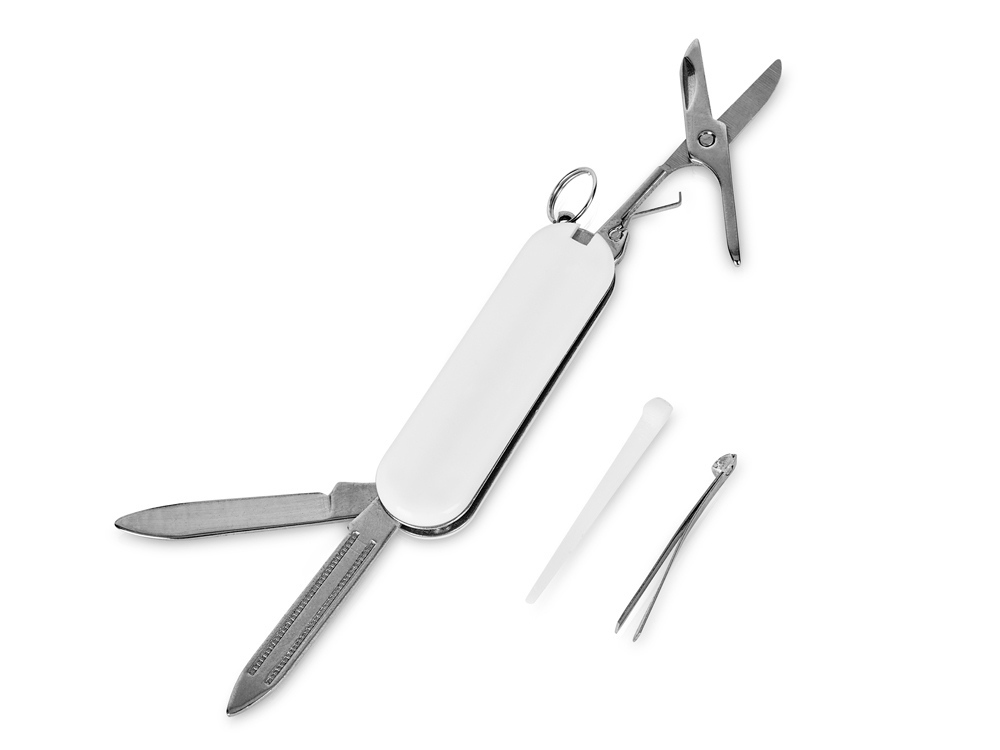 Складной нож в пластиковом глянцевом корпусе. Можно удобно прикрепить на ключницу. В комплект входят:
