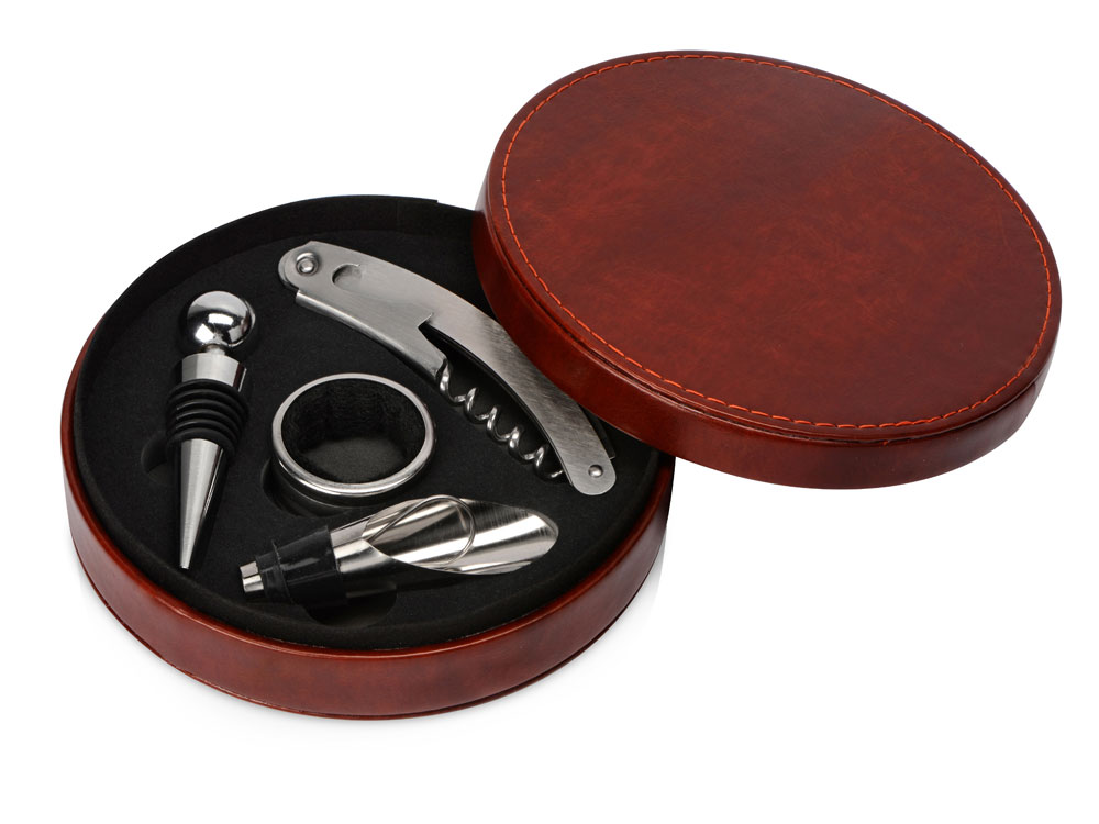 Набор винных аксессуаров состоит из воронки-аэратора, пробки, каплеуловителя и штопора. Металлические детали выполнены из нержавеющей стали, устойчивой к коррозии, также использованы силиконовая резина и АБС-пластик, абсолютно безопасный для человека.