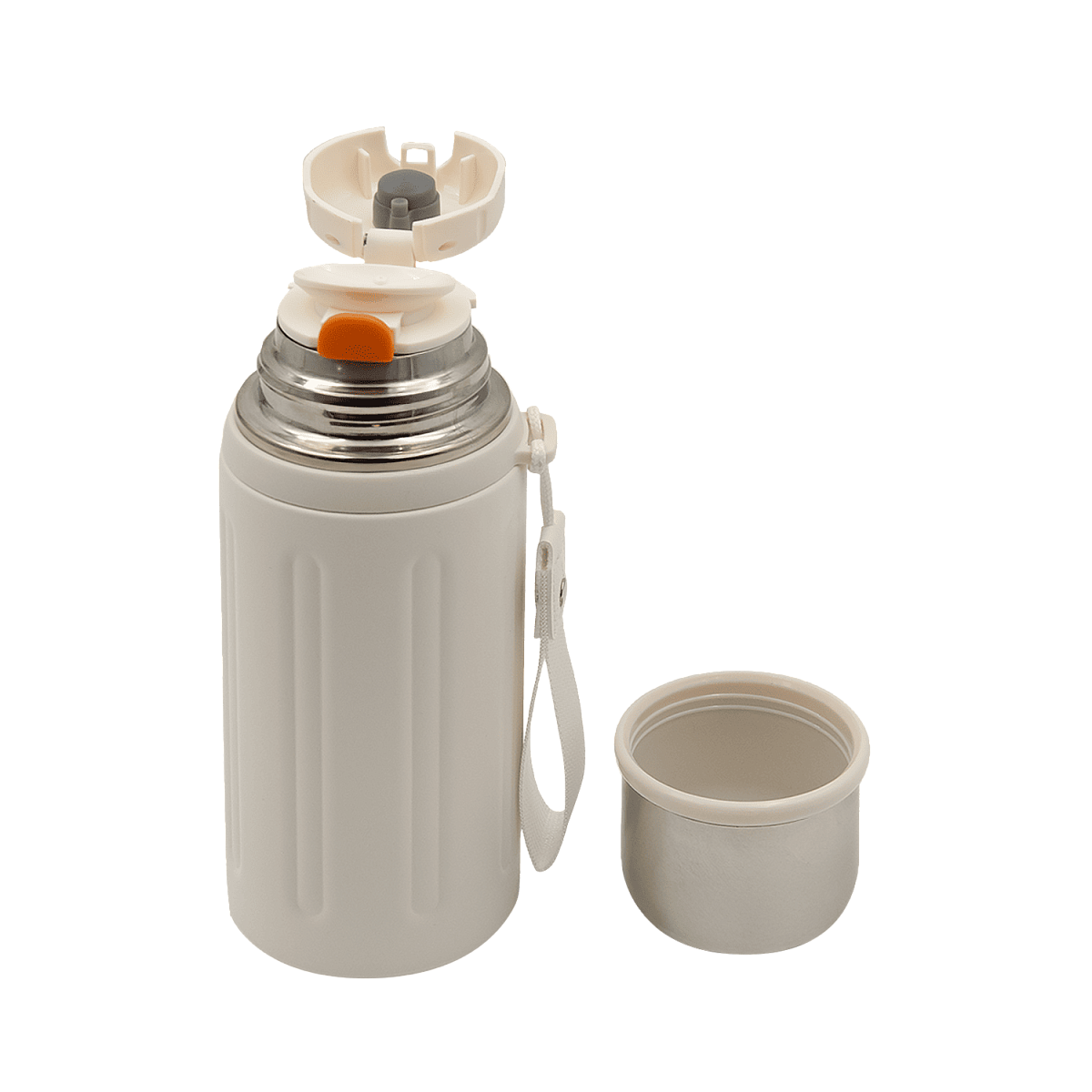 Объем в 600 мл позволит взять с собой достаточно напитка, будь то горячий кофе, ароматный чай или освежающий холодный сок. Крышка термоса является важной частью функциональности и удобства использования. Она состоит из двух частей: крышки-чашки и крышки с клапаном. Обе они имеют завинчивающийся механизм, который обеспечивает надежную герметичность. Крышка-чашка имеет емкость 100мл и предназначена для самостоятельного питья: в нее удобно наливать напиток и держать в руках. Съемный ремешок термоса сделает переноску удобной и комфортной.