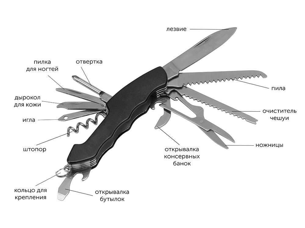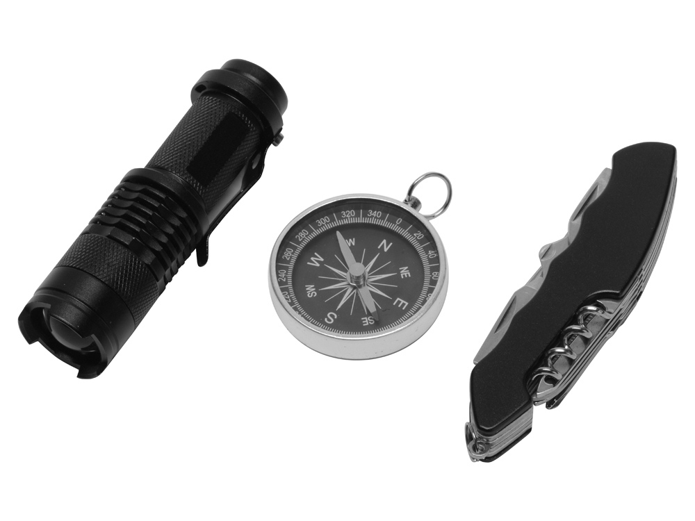 Комплектность: фонарик d2,4 х 9 см, компас d4,3 х 0,9 см, нож-мультитул 9,7 х 2,6 см (в сложенном виде)