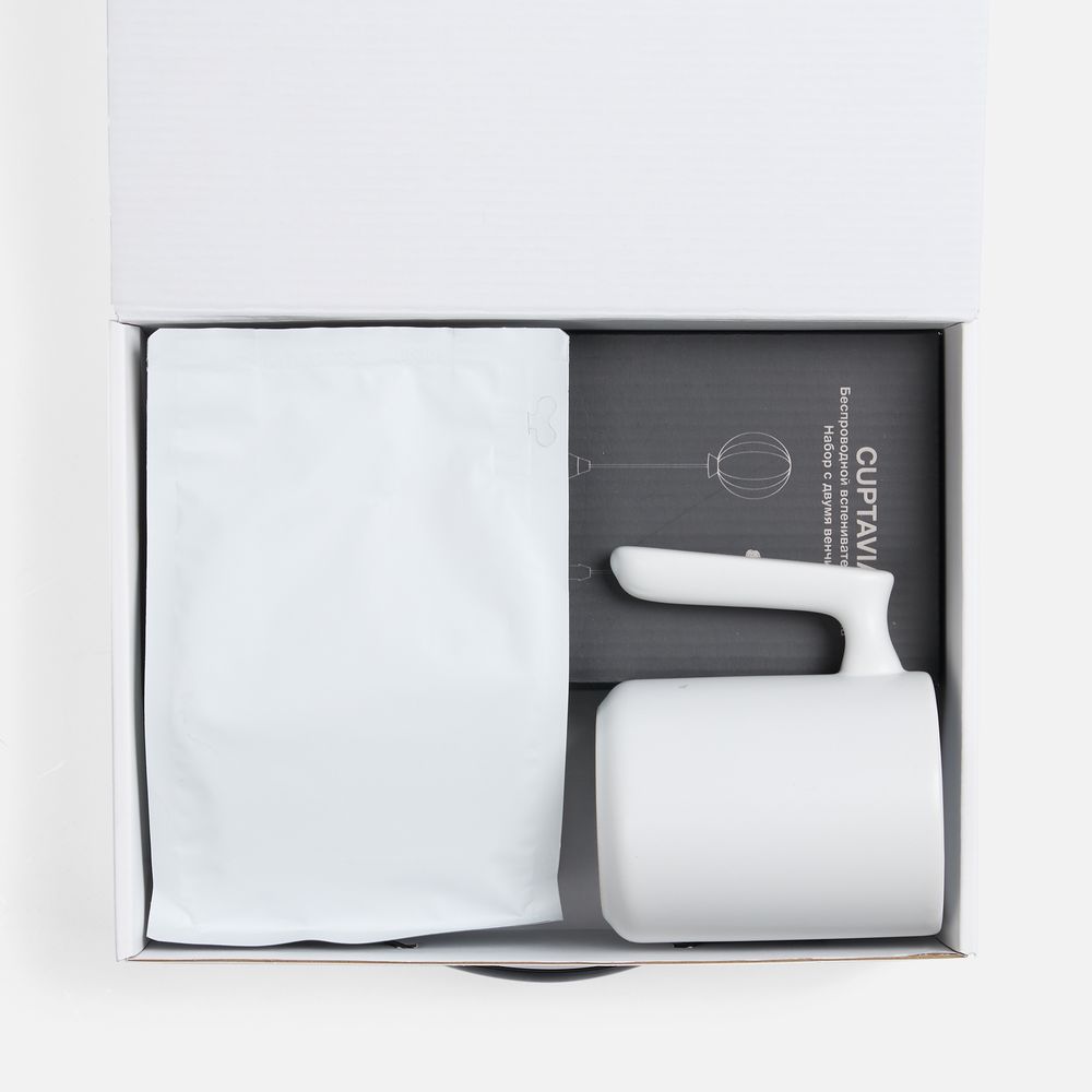 Размер: Вспениватель: 11х4,7х23,3 см; кружка: диаметр 8 см, ширина с ручкой 11,2 см, высота 10,2 см; пачка кофе: 13х4,5х18,5 см; коробка: 26,3x36,6x10 см