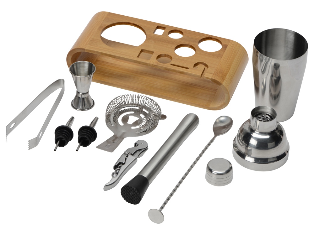 Комплектность: бамбуковая подставка- 27,3 х 10,6 х 6,6 см, барная ложка, джиггер 15/30 мл, гейзер -2 шт, мадлер, штопор, стрейнер, щипцы для льда, шейкер 550 мл