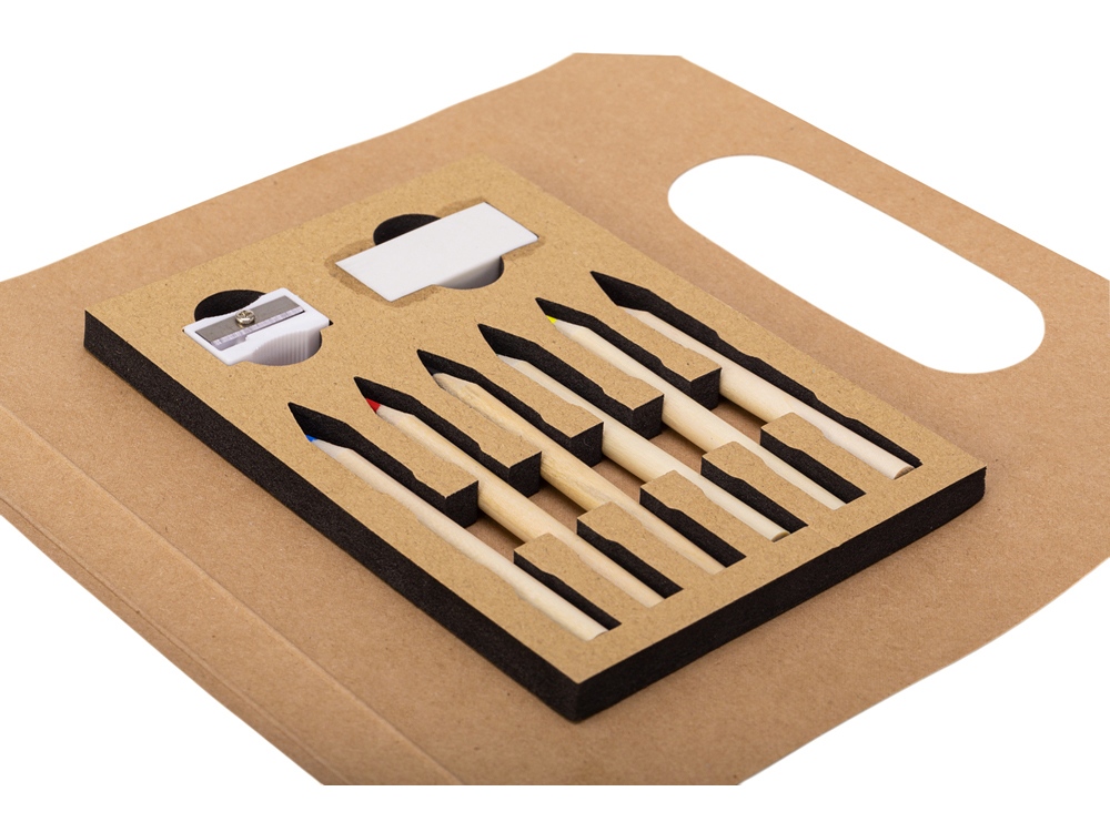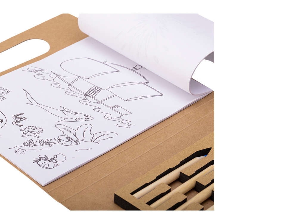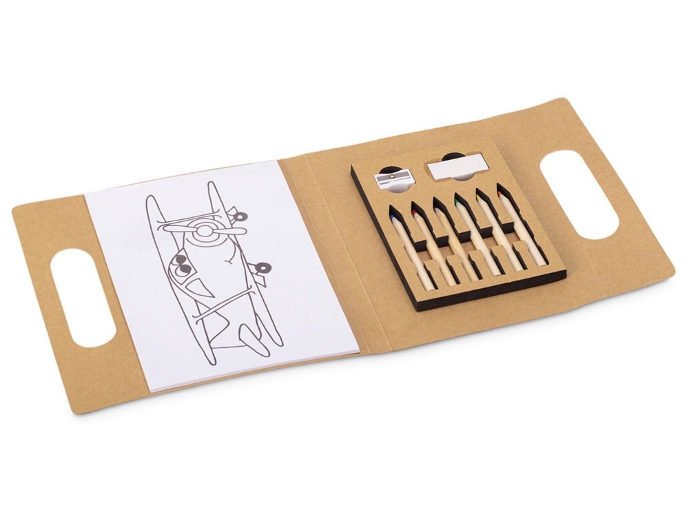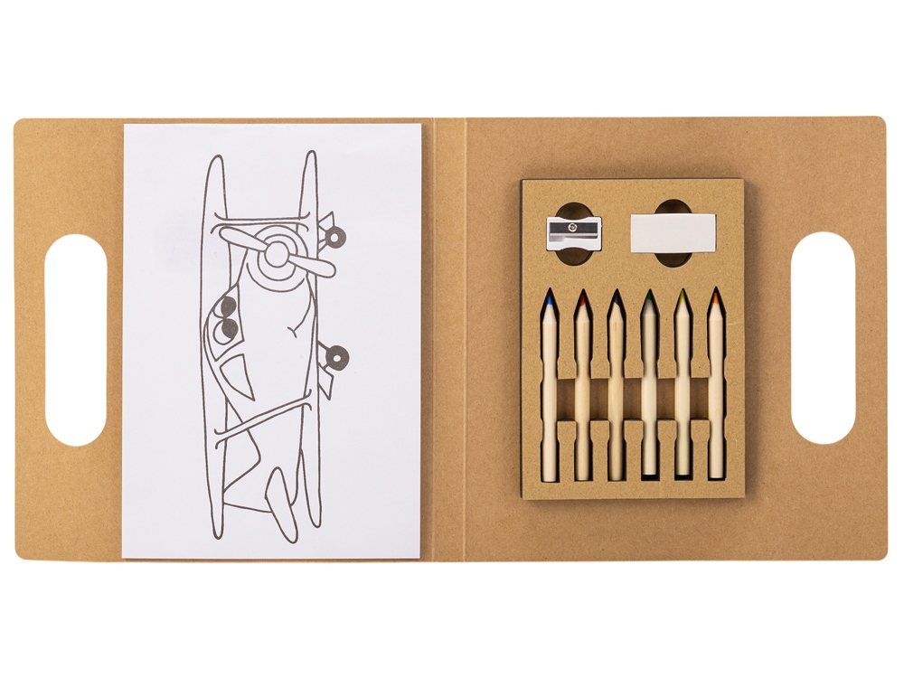 Детский набор для рисования. В комплекте блокнот для рисования, 6 цветных карандашей, точилка и ластик.