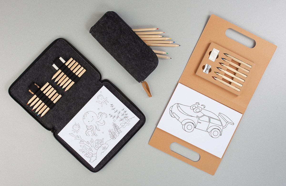 - Картонная папка позволяет удобно хранить все принадлежности и рисунки.
