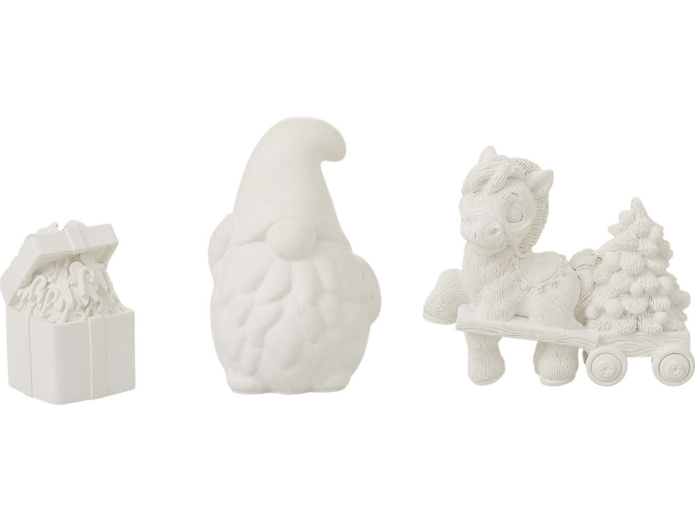 В набор входят три гипсовых фигурки — лошадка елочкой, гном подарочная коробка с пряничными человечками, а также акварельные краски и кисть.