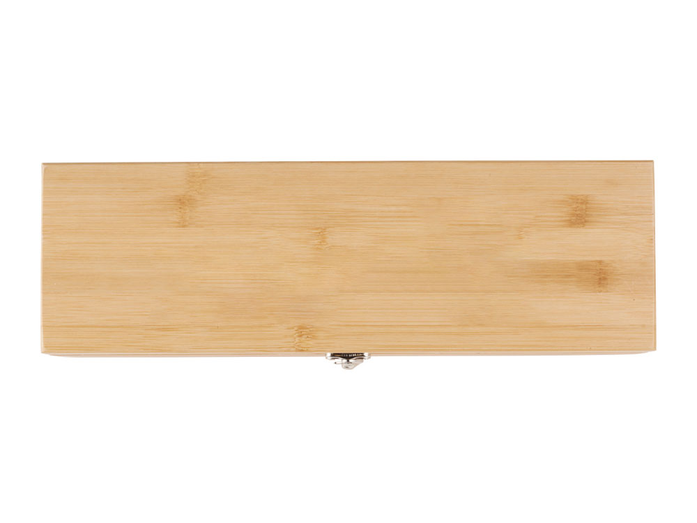 Набор Anniversary представляет собой прямоугольный бамбуковый футляр для бутылки вина, дополненный кольцом-каплеуловителем, пробкой, воронкой и штопором, которые украшены бамбуковыми вставками. Аксессуары располагаются в специальных гнездах, расположенных на крышке, благодаря чему их очень удобно хранить. Из-за особенностей бамбукового материала качество лазерной печати может отличаться.