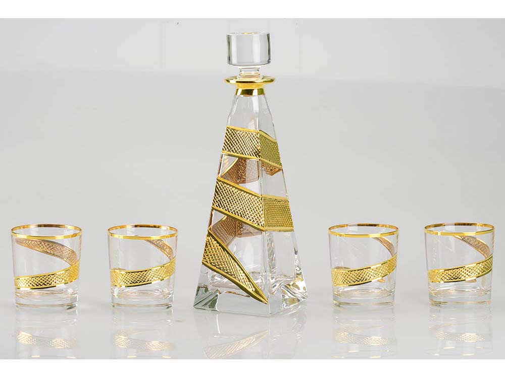 Набор для виски состоит из графина пирамидальной формы и 4 бокалов. Набор выполнен из тонкого хрусталя, украшенного позолотой. Графин станет непременным атрибутом неформальной встречи с ключевыми партнерами.