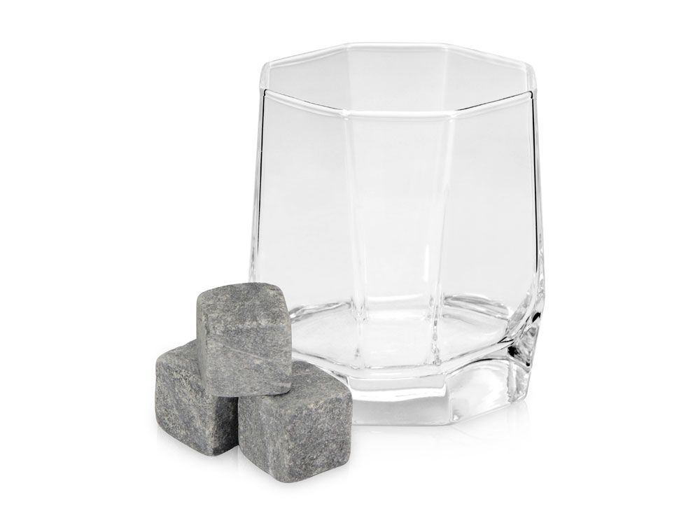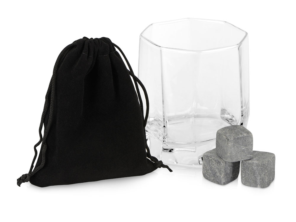 Набор поставляется в брендированной коробке. В комплекте находится 1 бокал для виски, 3 камня из талькохлорита и бархатный мешочек. Объем бокала 300мл.
