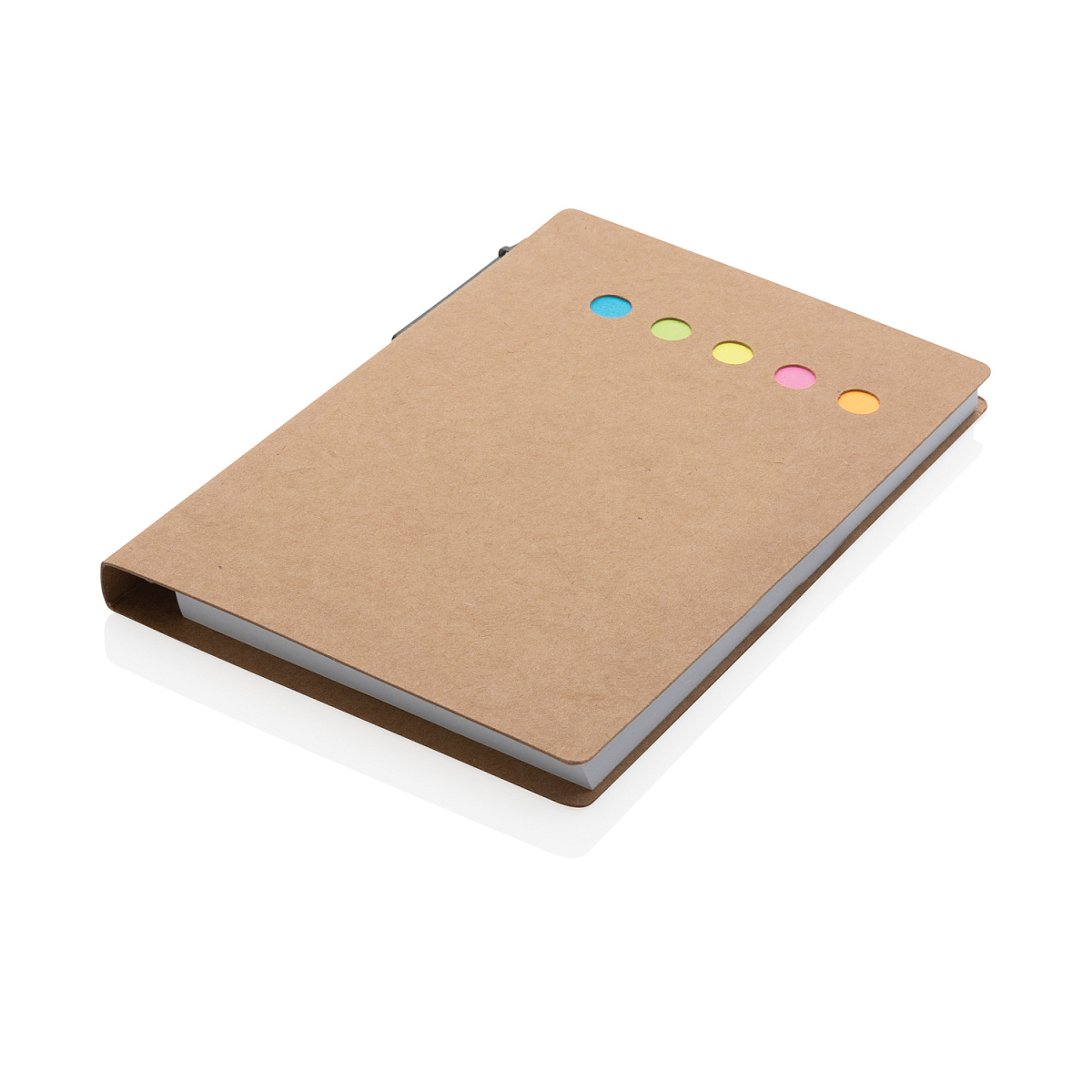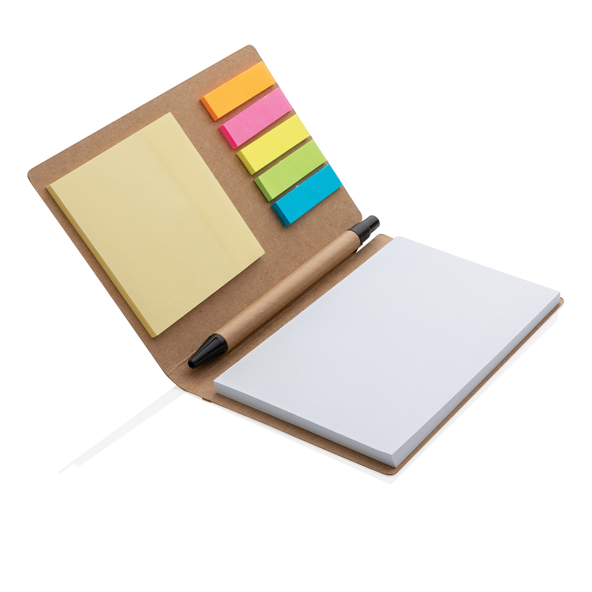С этим компактным набором для заметок Kraft вы не забудете о важных делах. В комплект входят: плотная крафтовая обложка (350 г/м2), большой блокнот из 50 листов, средний блокнот из 25 листов с липким краем и маленькие закладки в 5 цветах (по 25 шт.), ручка с корпусом из переработанной бумаги и пластика ABS. Ручка заправлена синей пастой и способна прочертить линию до 800 м. Длина 10 см., ширина 15 см., высота 1 см., диаметр 0 см.