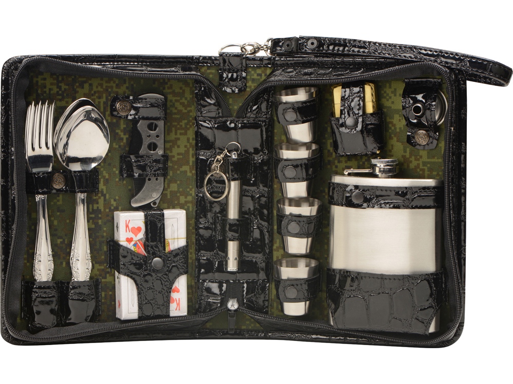 Оригинальный дорожный набор на 4 персоны в барсетке с удобным ремешком для переноски.