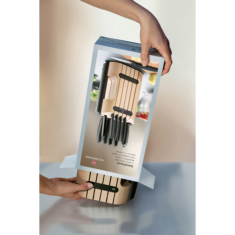 Набор из 11 кухонных ножей VICTORINOX, чёрная рукоять, в подставке из бука высотой 35,5 см можно заказать в нашей компании по самой доступной цене от 64 910 рублей.