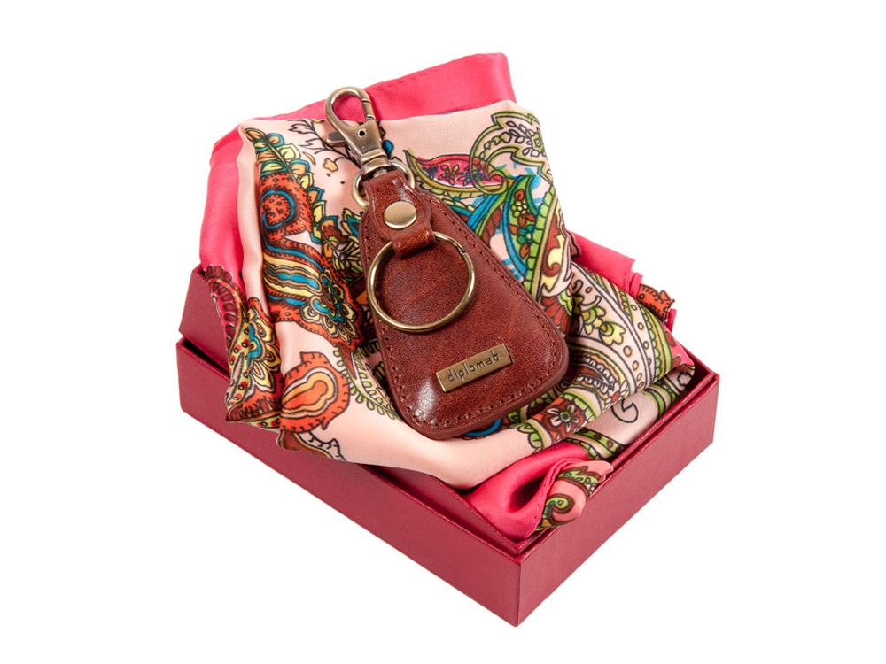 Этот подарок состоит из двух предметов – функционального брелока для ключей и нарядного шёлкового платка. Небольшой аккуратный брелок с кольцом для ключей сделан из натуральной кожи коньячного цвета и снабжён карабином – его можно надёжно прикрепить внутри дамской сумочки. Нежно-розовый платок с цветочным орнаментом очень женственен и отлично подойдет к любому образу. Вам не нужно думать об упаковке подарка – комплект поставляется в нарядной подарочной коробке.