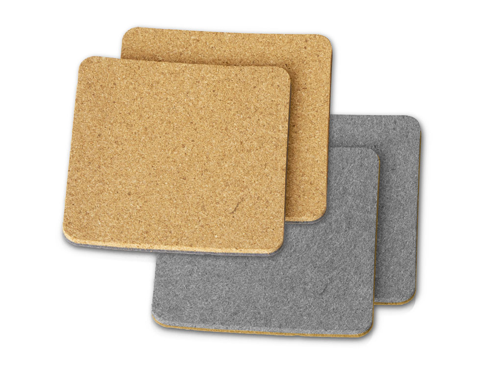 Четыре квадратных костера, выполненных из фетра и пробки. Благодаря выбору материалов посадка стаканов — мягкая и бесшумная: и пробка, и фетр заглушают звук, безопасны и для посуды, и для поверхности стола, защищая от механических повреждений и загрязнения.
