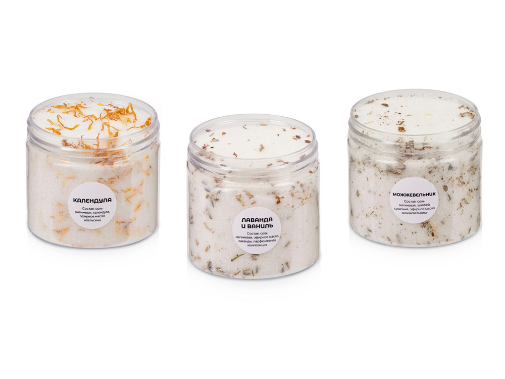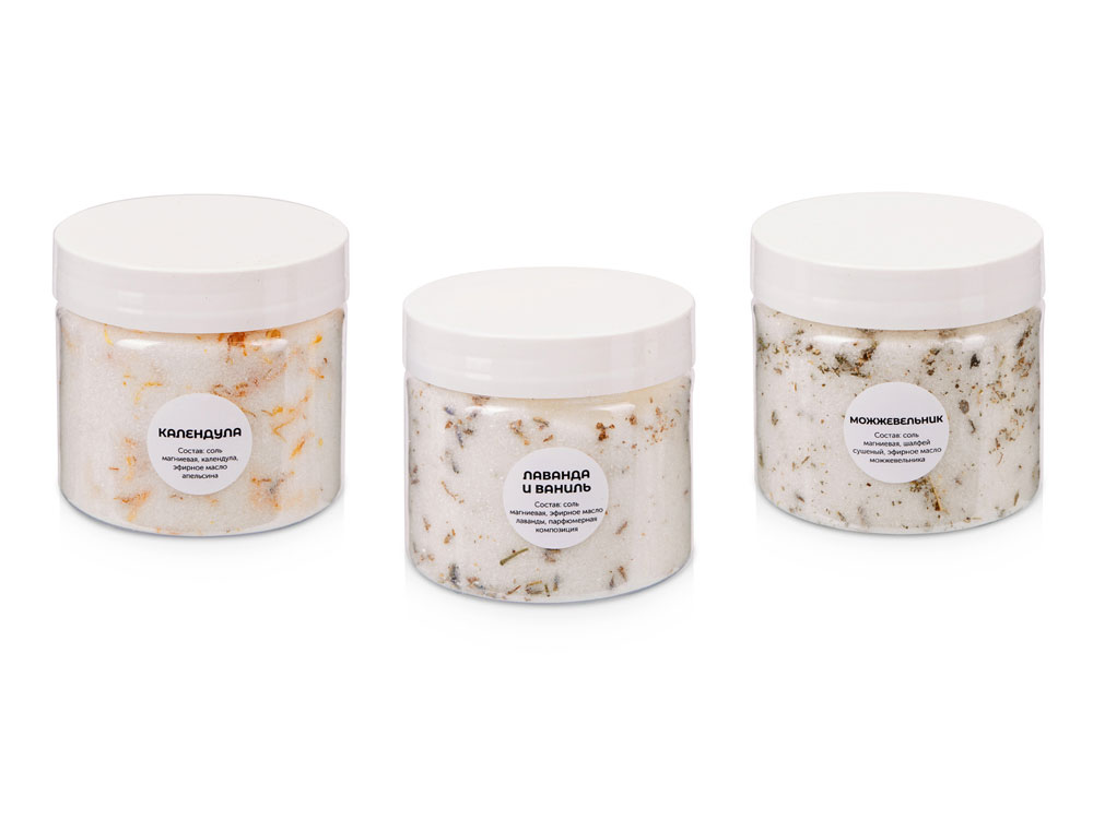 Комплектность: соль для ванны календула в банке, соль для ванны лаванда-ваниль в банке, соль для ванны можжевельник в банке, упаковочный материал