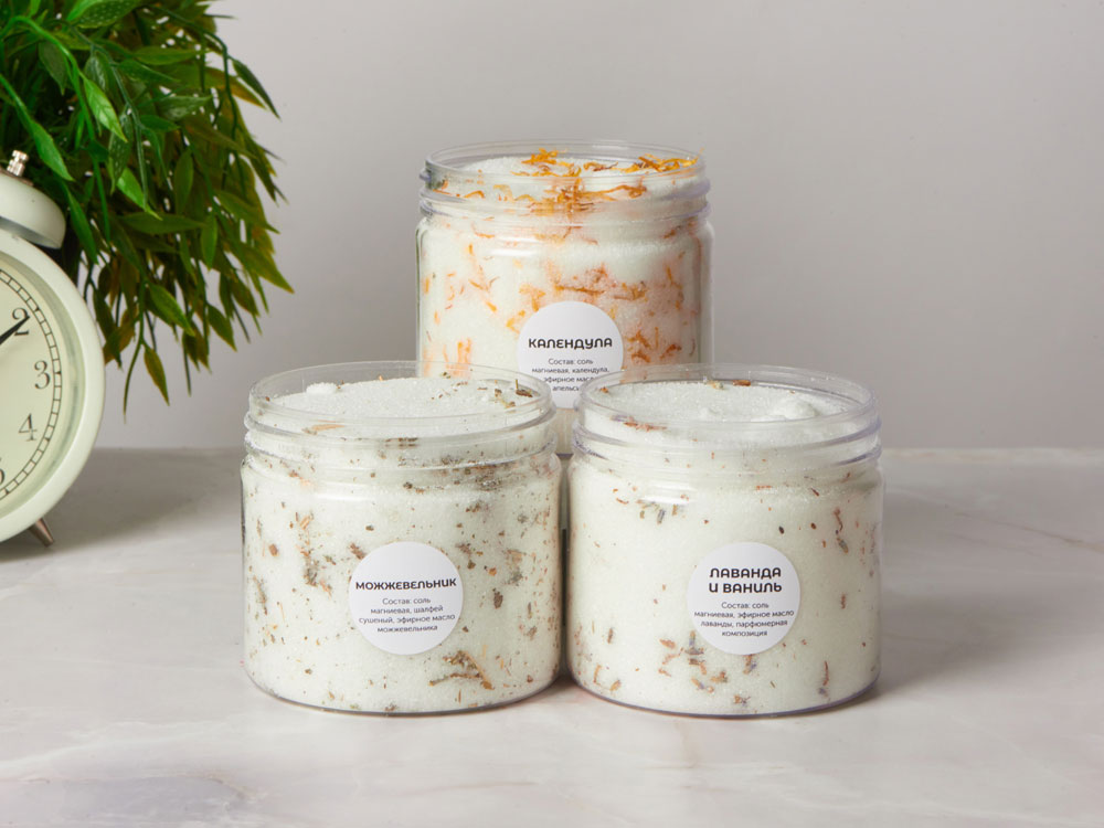 В набор входит три банки соли с ароматами календулы, можжевельника и лаванды с ванилью.