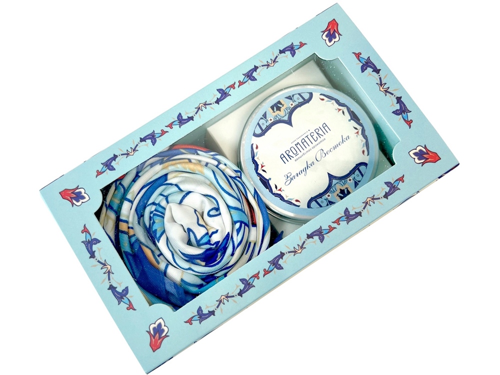 Набор состоит из платка Русский полевой букет от бренда Русские в моде и ароматической свечи Ароматные травы от AROMATERIA.