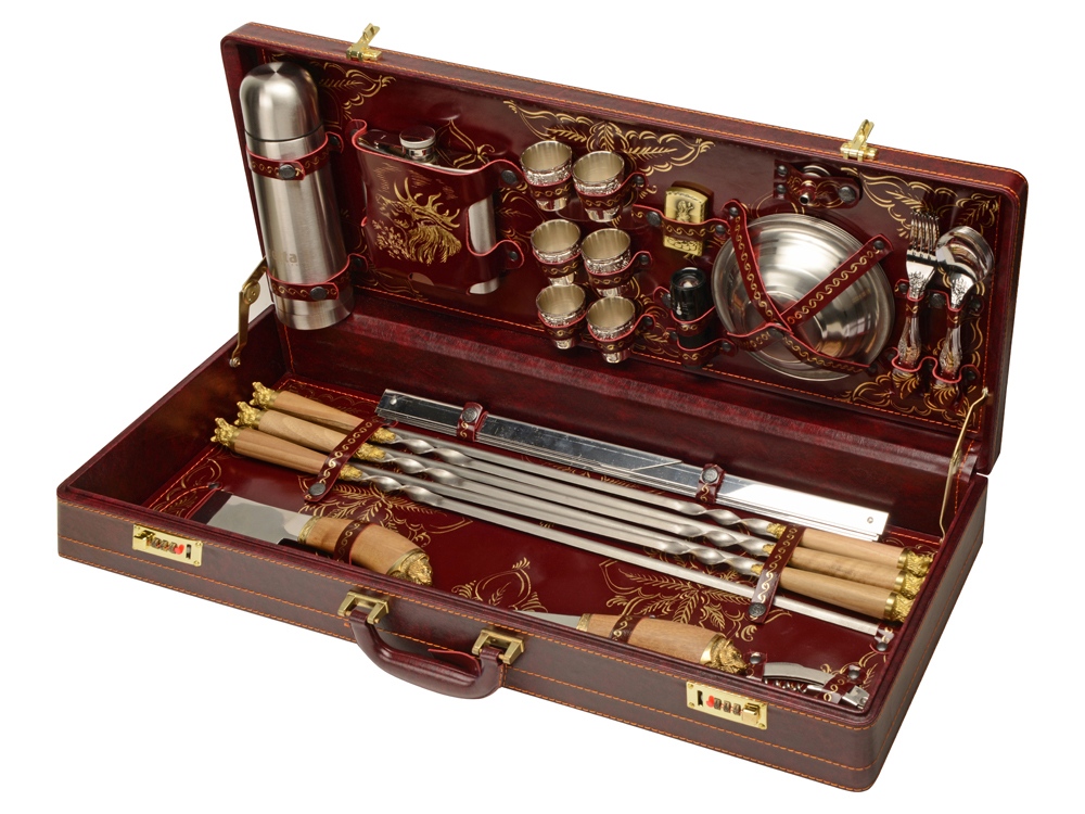 Комплектность: ножТяпка, нож, штопор, ножки для мангала-2шт, шампур-6шт, термос, фляга, стопка-6шт, зажигалка, фонарик, тарелка-6шт, воронка, ложка-6шт, вилка-6шт