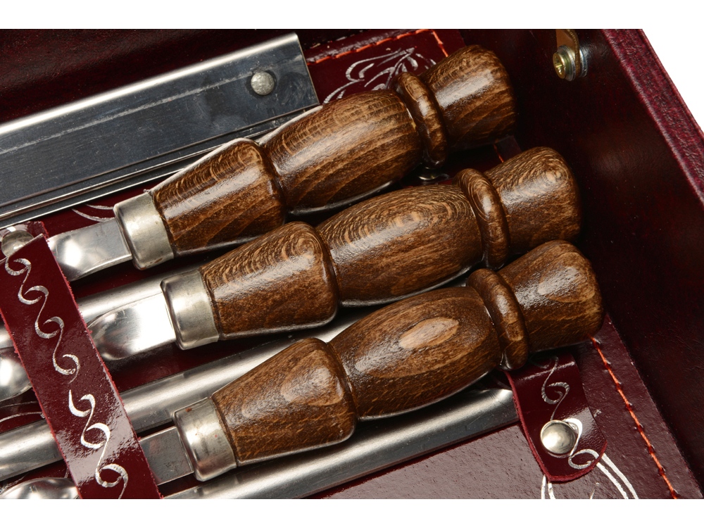 Комплектность: стопка- 6шт, термос, вилка- 6шт, ложка- 6шт, вилка для барбекю, нож, ножки для мангала- 2шт, шампур- 6шт, штопор, нож Проводник